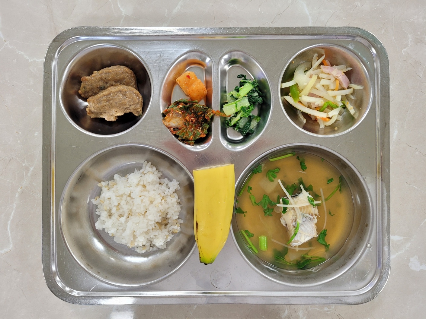 2024년10월22일 (롸) 식단: 찰보리밥, 얼큰동태찌개, 생깻잎지(자), 단배추나물, 감자채베이컨볶음, 복돼지떡갈비, 깍두기, 바나나