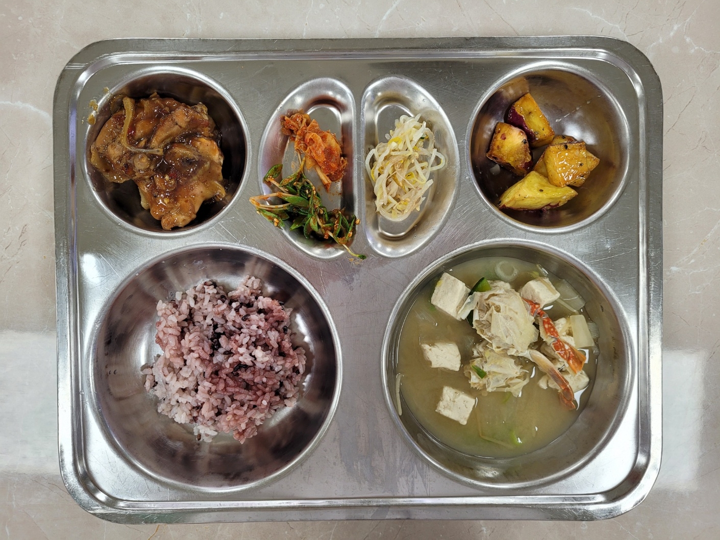 2024년10월28일 (월) 식단: 발아흑미밥, 꽃게탕, 숯불스테이크, 돌나물무침(자), 숙주나물무침, 견과류고구마맛탕, 배추김치
