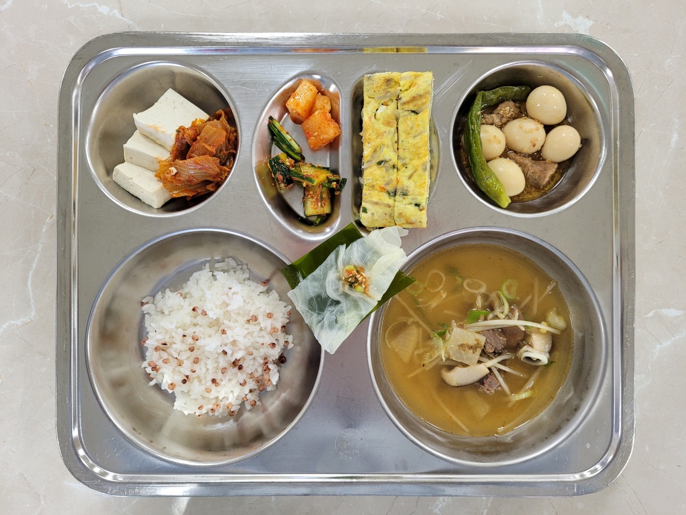 2024년10월29일 (화) 식단: 차수수밥, 쇠고기무국, 메추리알장조림, 오이소박이, 두부신김치볶음, 당면달걀말이, 깍두기, 양배추다시마쌈(자)