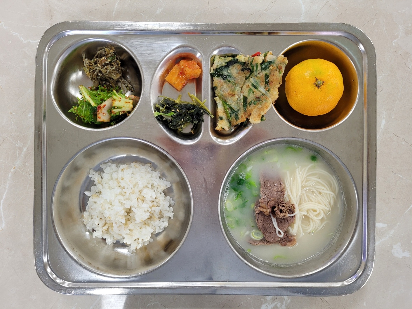 2024년10월31일 (목) 식단: 발아현미밥, 곰탕/소면, 모듬야채겉절이, 취나물무침(자), 마늘편멸치볶음, 부추전, 깍두기, 귤