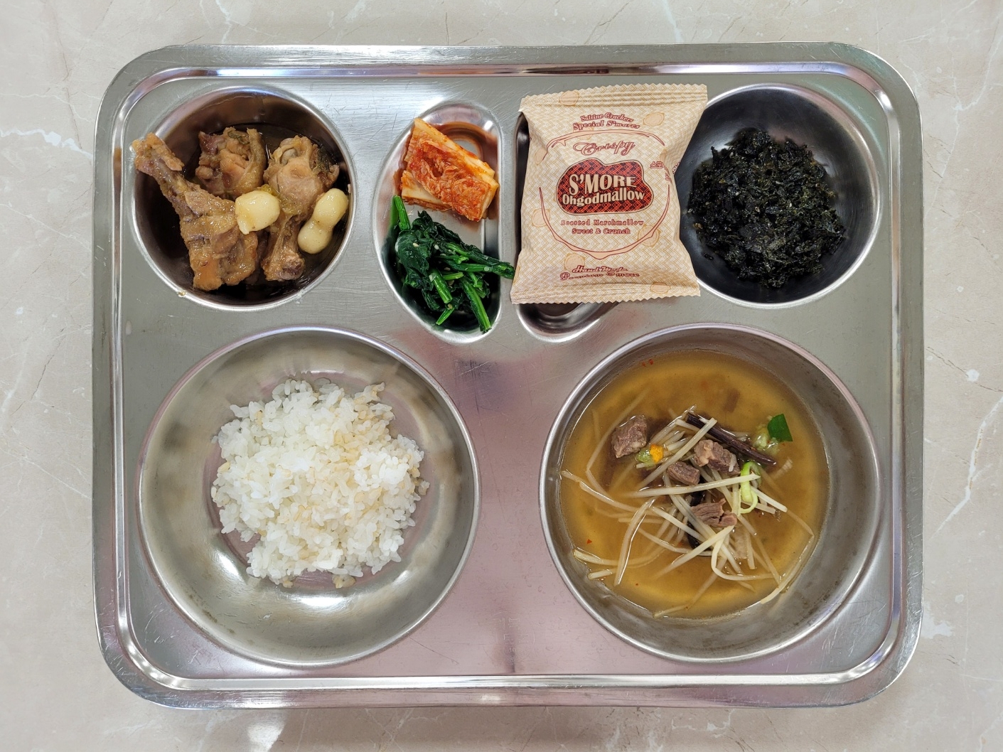2024년11월11일 (월) 식단: 발아현미밥, 쇠고기무국, 닭봉간장조림, 시금치나물, 수제퍼래김자반, 배추김치, 크리스피쿠키(머쉬멜로우)