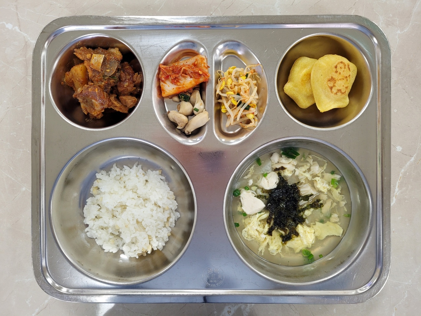 2024년11월19일 (화) 식단: 찰보리밥, 순두부달걀탕, 동인동찜갈비, 꼬마새송이버섯, 콩나물무침, 배추김치, 미니붕어빵