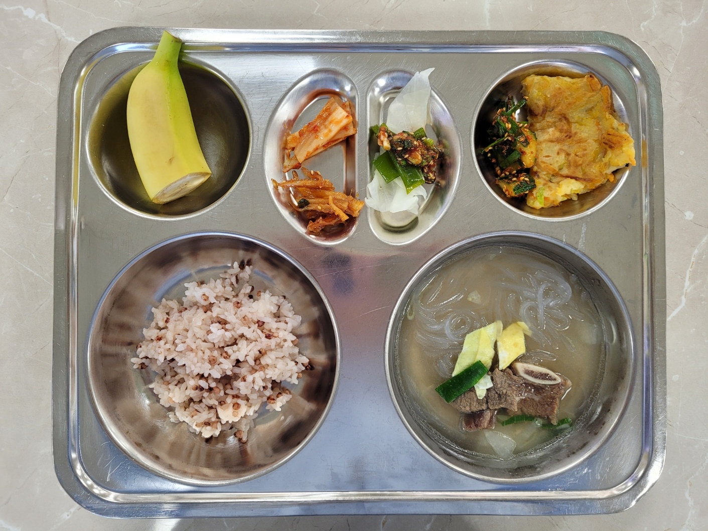 2024년11월22일 (금) 식단: 차수수밥, 갈비탕, 오이소박이, 진미채무침, 늙은호박전, 배추김치, 양배추다시마쌈(자), 바나나