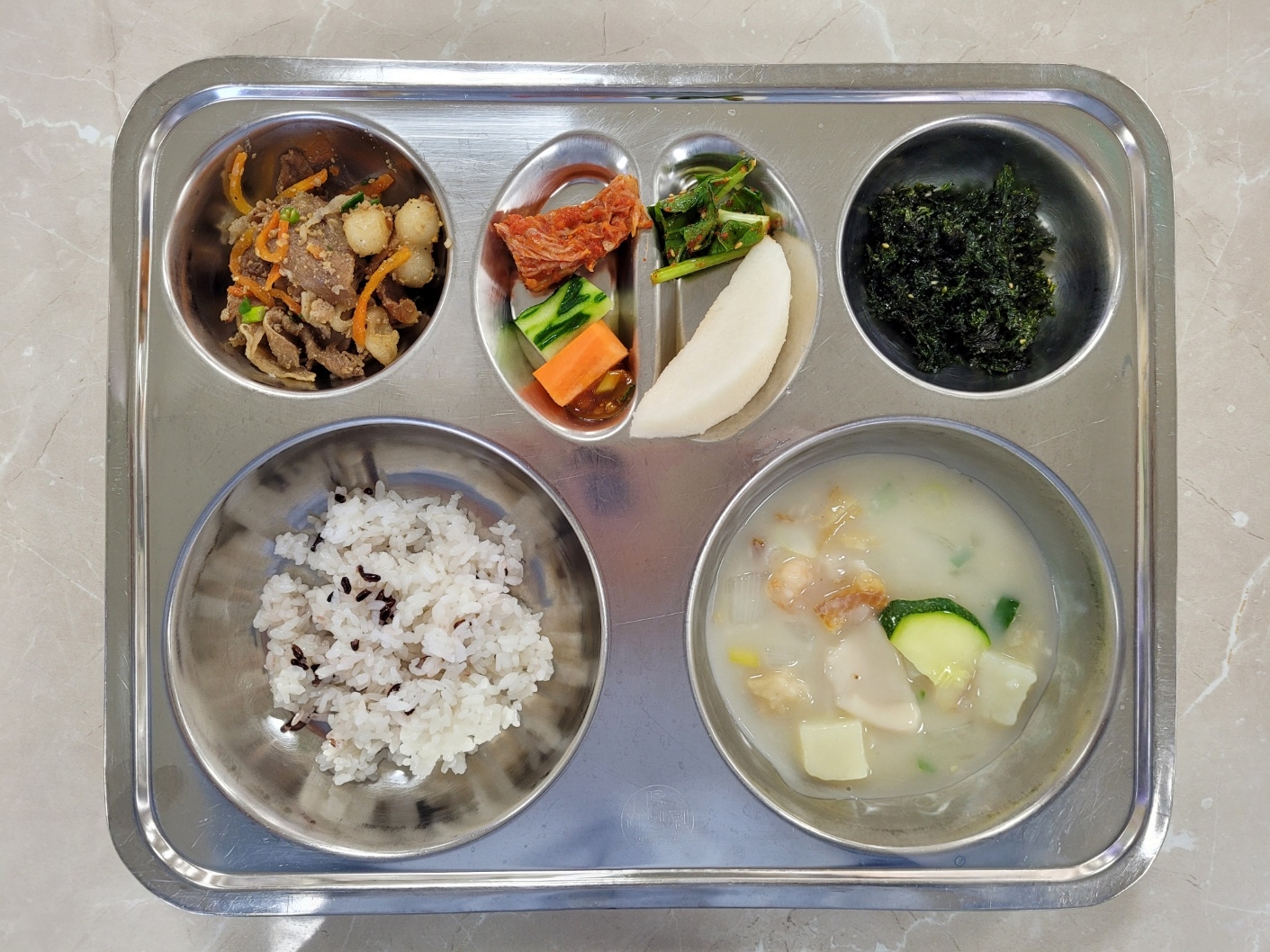 2024년12월2일 (월) 식단: 발아흑미밥, 감자수제비국, 겨울초겉절이, 바싹떡불고기, 수제파래김자반, 배추김치, 배, 오이당근스틱