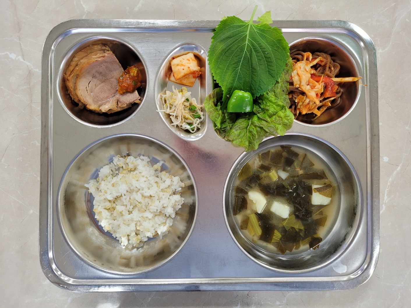 2024년12월4일 (수) 식단: 찰보리밥, 아욱국(건새우), 족발/쌈장, 비빔막국수, 숙주나물무침, 배추김치, 상추깻잎쌈(자)