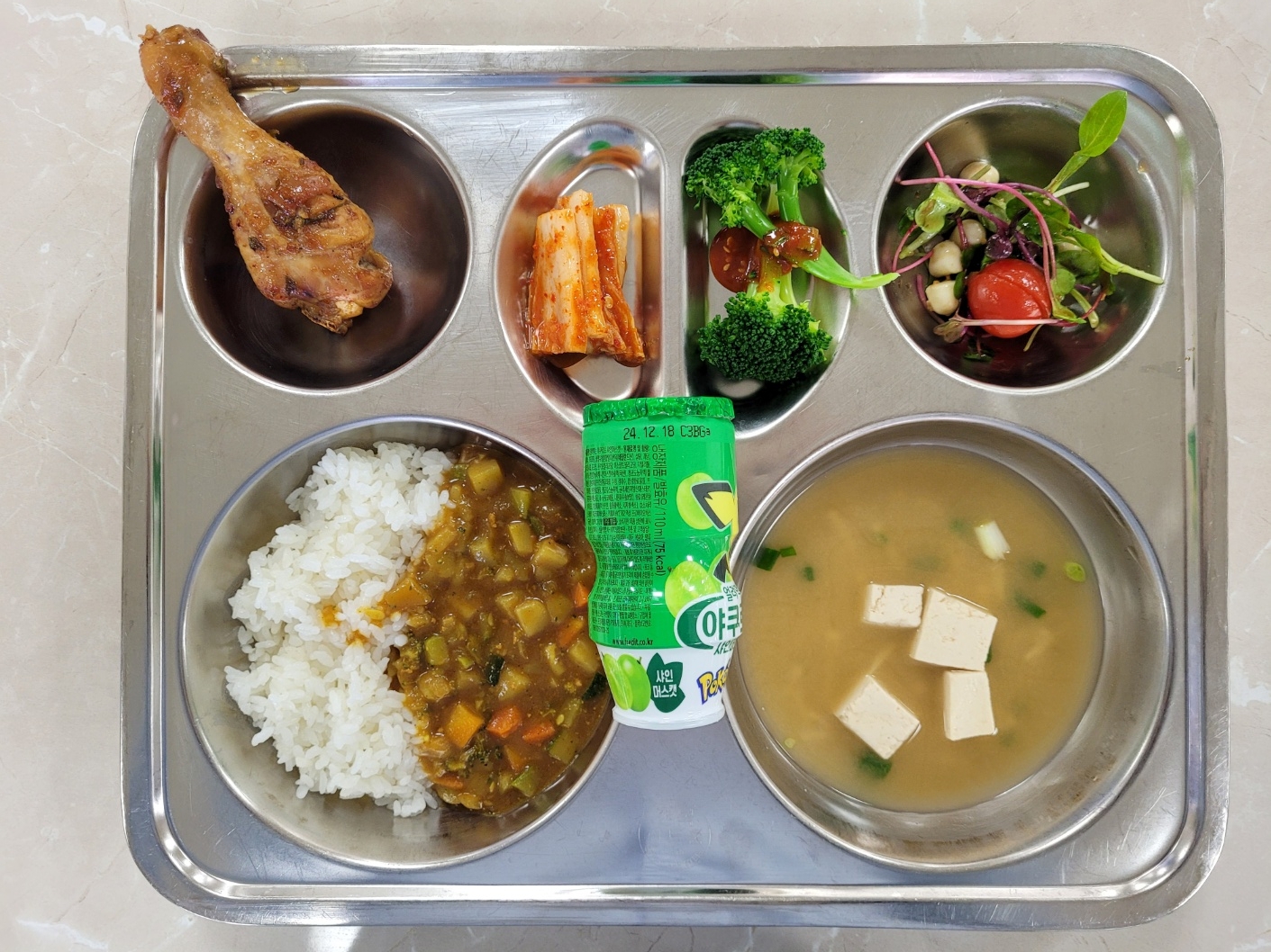 2024년12월5일 (목) 식단: 파니르커리/쌀밥, 미소국, 방울토마토카프레제, 닭다리오븐구이, 배추김치, 청포도요구르트, 브로콜리초고주창(자)