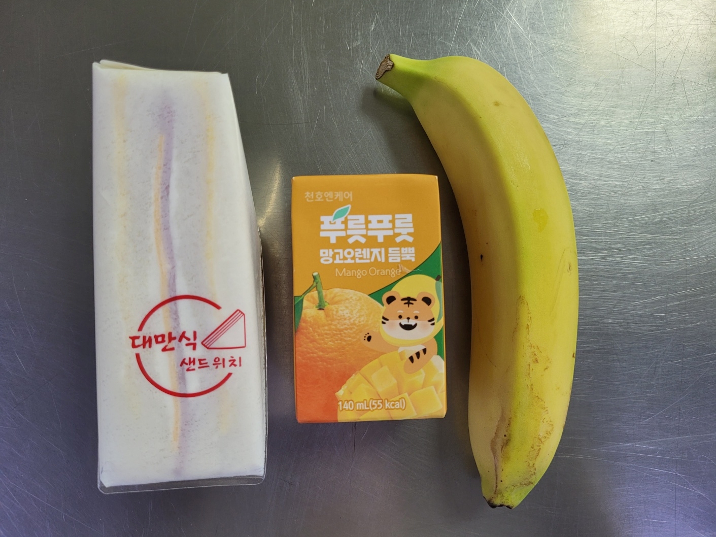 2024년12월6일 (금) 총파업에 따른 대체 식단: 햄치즈버터샌드위치, 망고오렌지쥬스, 바나나
