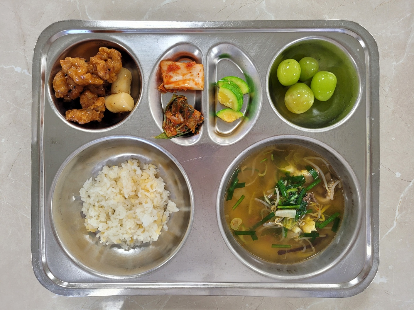 2024년12월9일 (월) 식단: 단호박카로틴쌀밥, 육개장, 생깻잎지(자), 애호박나물, 순살치킨떡강정, 배추김치, 청포도