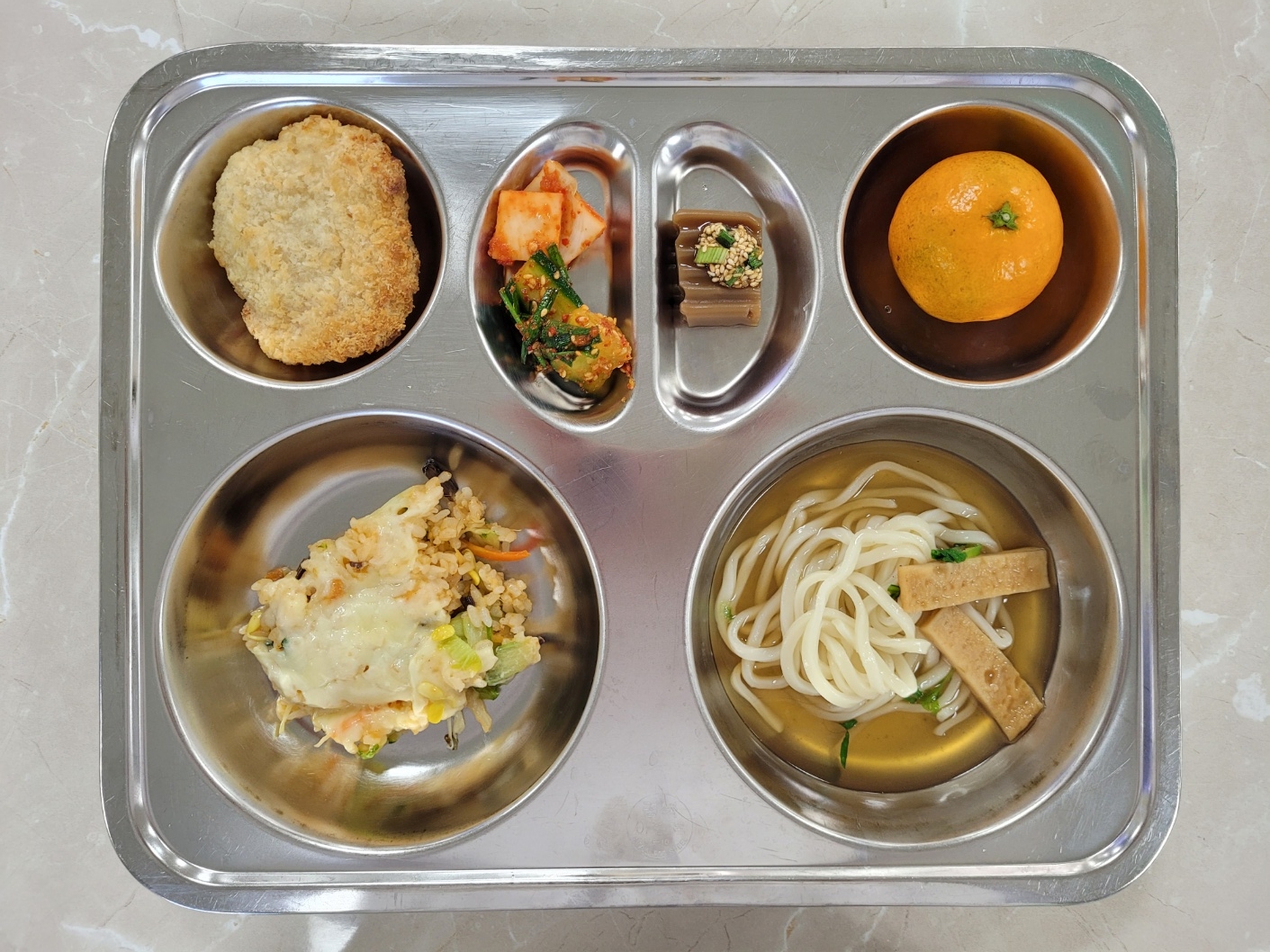 2024년12월10일 (화) 다채롭데이식단: 치즈오방색나물밥, 미니우동, 도토리묵/양념장(자), 오이소박이, 통살새우까스, 배추김치, 귤