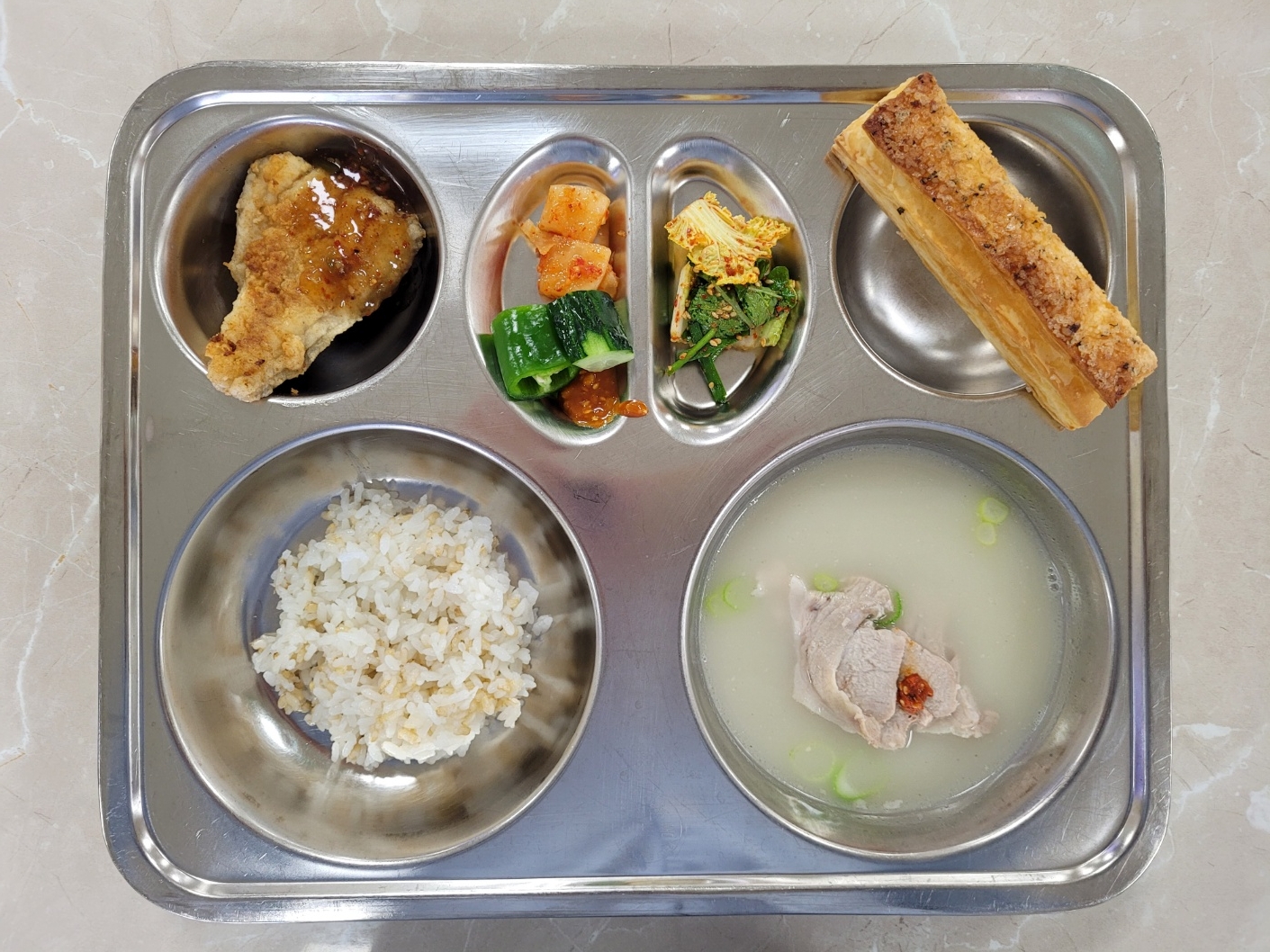 2024년12월11일 (수) 식단: 발아현미밥, 돼지따로국밥, 얼갈이부추겉절이, 삼치구이/양념장, 깍두기, 갈릭파이, 오이고추쌈(자)