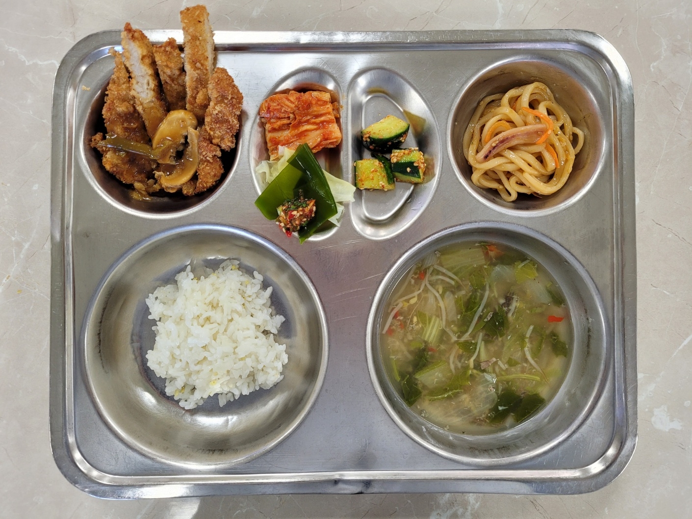 2025년1월3일 (금) 식단: 기장밥, 추어탕, 오이소박이, 오징어볶음우동, 수제돈까스, 배추김치, 양배추다시마쌈(자)
