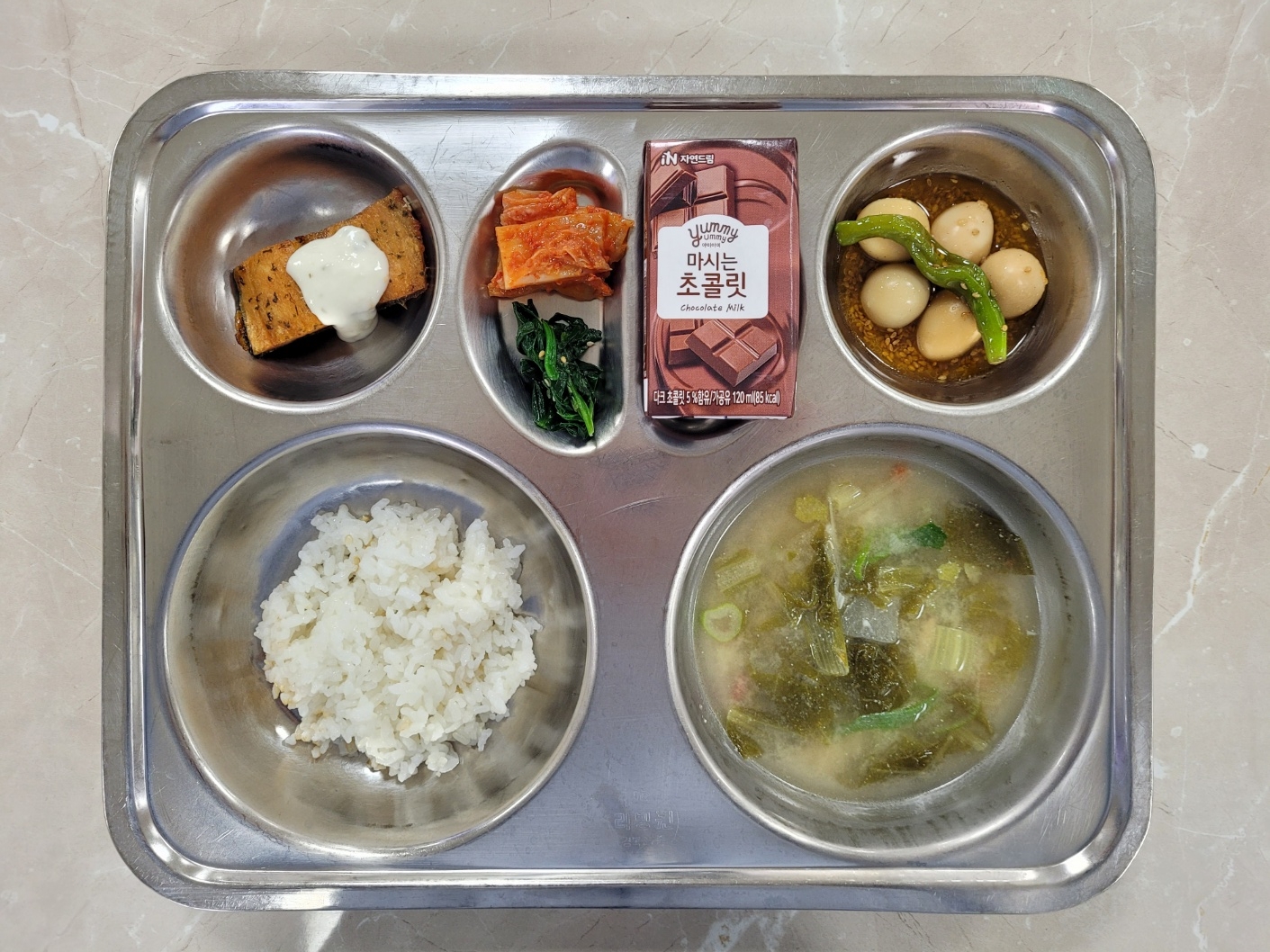 2025년1월6일 (월) 다채롭데이식단: 발아현미밥, 들깨우거지국, 메추리알장조림, 시금치나물무침, 연어스테이크/소스, 배추김치, 마시는초콜릿