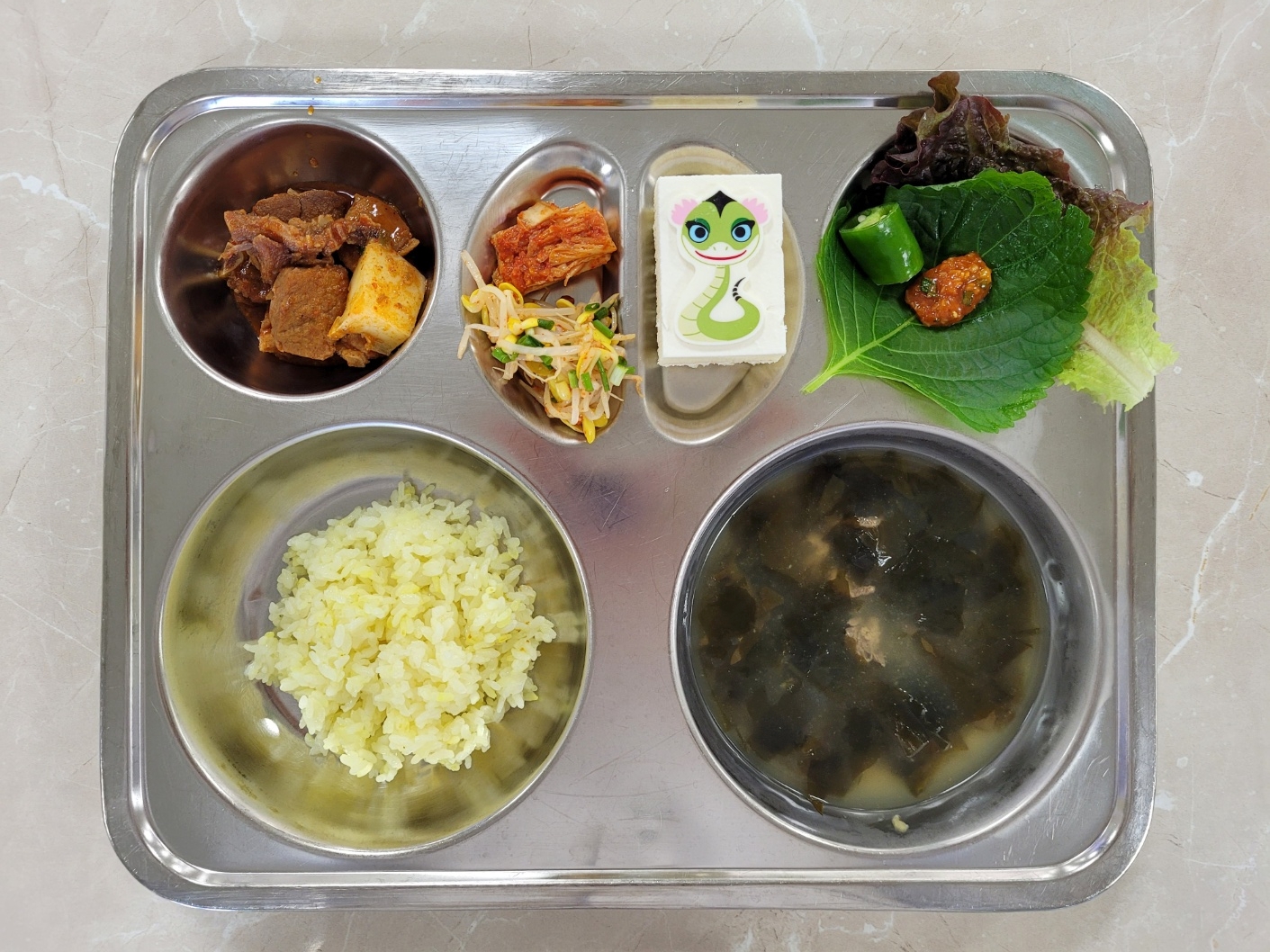 2025년1월7일 (화) 생일밥상 식단: 강황쌀밥, 쇠고기미역국, 동인동찜갈비, 콩나물무침, 배추김치, 우리밀바이퍼케이크, 상추깻잎쌈(자)