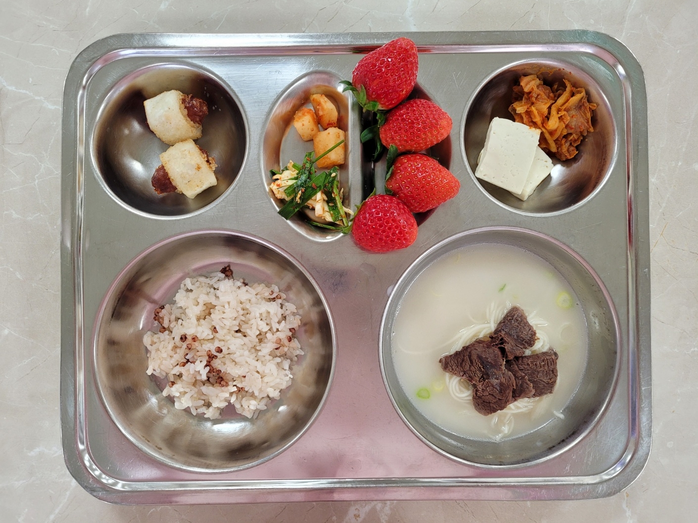 2025년1월9일 (목) 식단: 차수수밥, 곰탕/소면, 양배추부추무침, 두부신김치볶음, 소품떡, 깍두기, 딸기