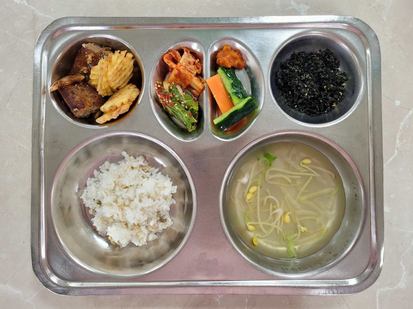 2025년3월5일 (수) 식단: 발아현미밥, 콩나물무채국, 봄동겉절이, 수제함박스테이크/벌집감자, 수제파래김자반, 배추김치, 오이당근스틱(자)