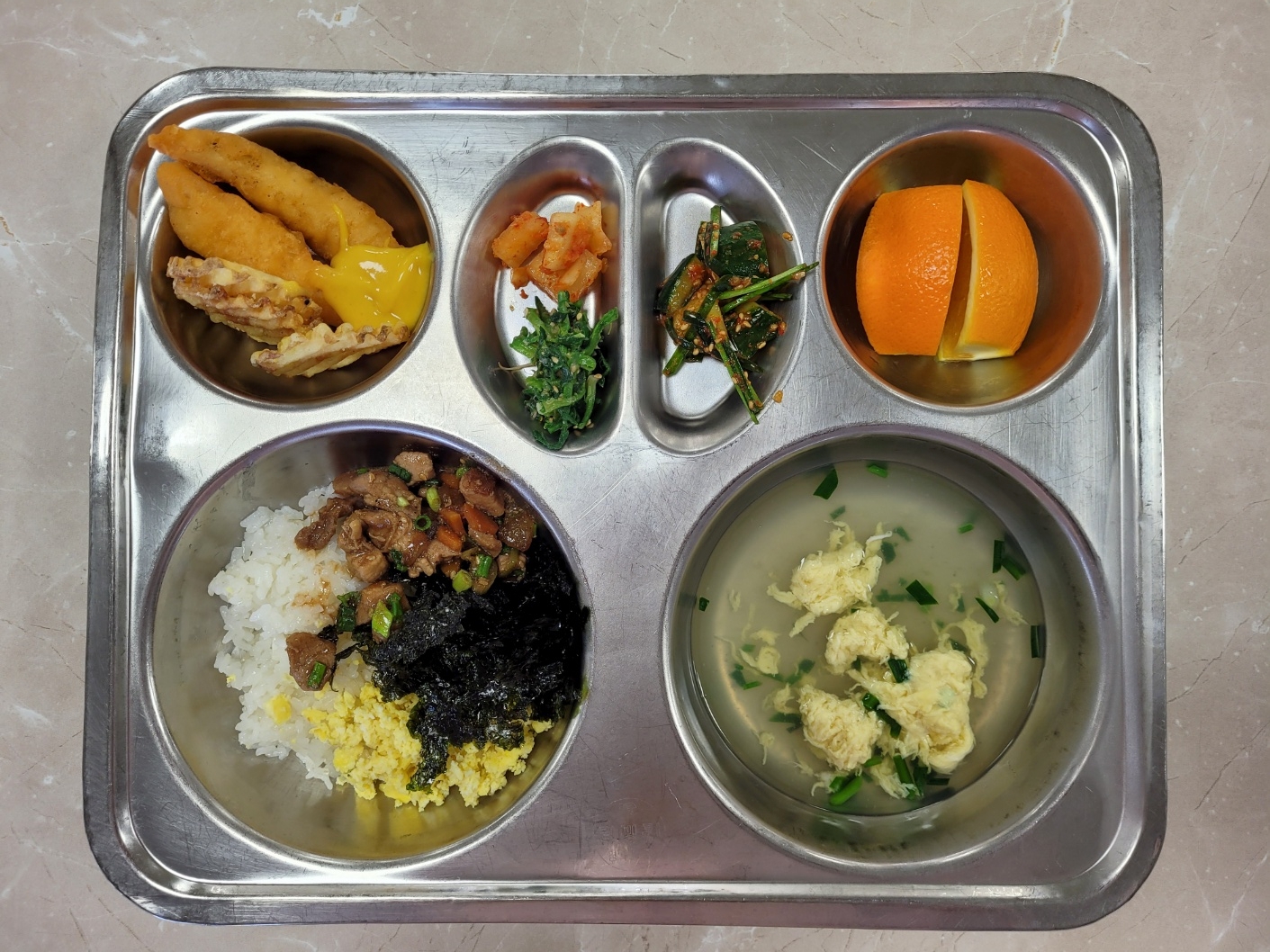 2025년3월11일 (화) 식단: 장조림비빔밥, 계란부추국, 냉이된장무침, 오이소박이, 피쉬앤칩스, 깍두기, 오렌지