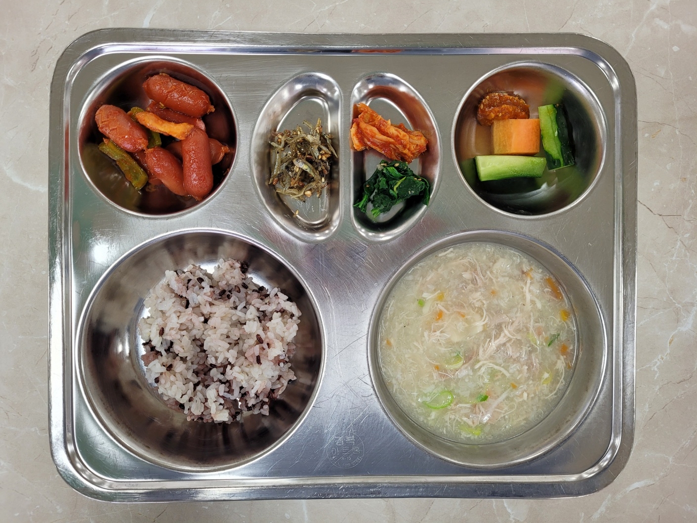 2025년3월13일 (목) 식단: 발아흑미밥, 삼계탕, 시금치나물, 통곡물멸치볶음, 비엔나소시지볶음, 배추김치, 오이당근스틱(자)