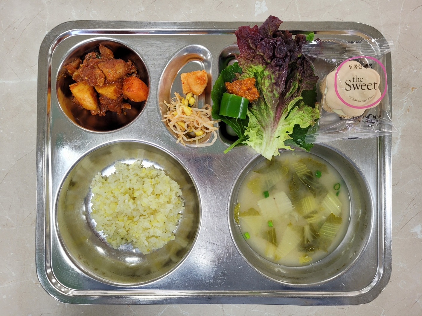 2025년3월14일 (금) 식단: 강황쌀밥, 봄동된장국, 동인동찜갈비, 콩나물무침, 깍두기, 콫카롱, 상추깻잎쌈(자)
