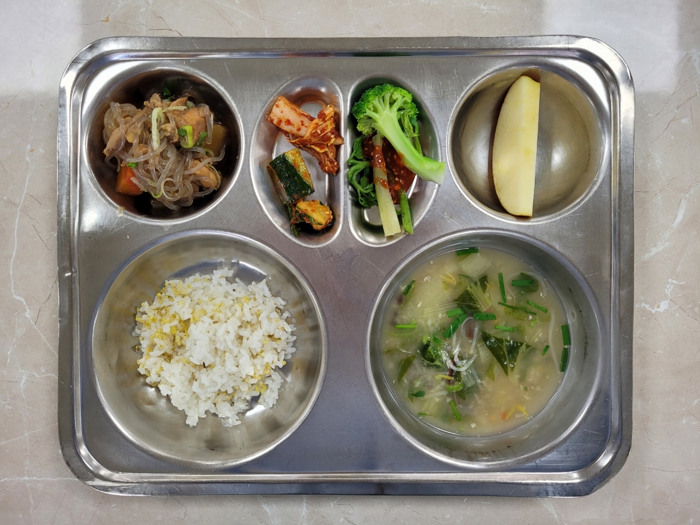 2025년3월20일 (목) 식단: 기장밥, 장어국, 안동식조림닭, 두릅브로콜리/초장(자), 오이소박이, 배추김치, 사과
