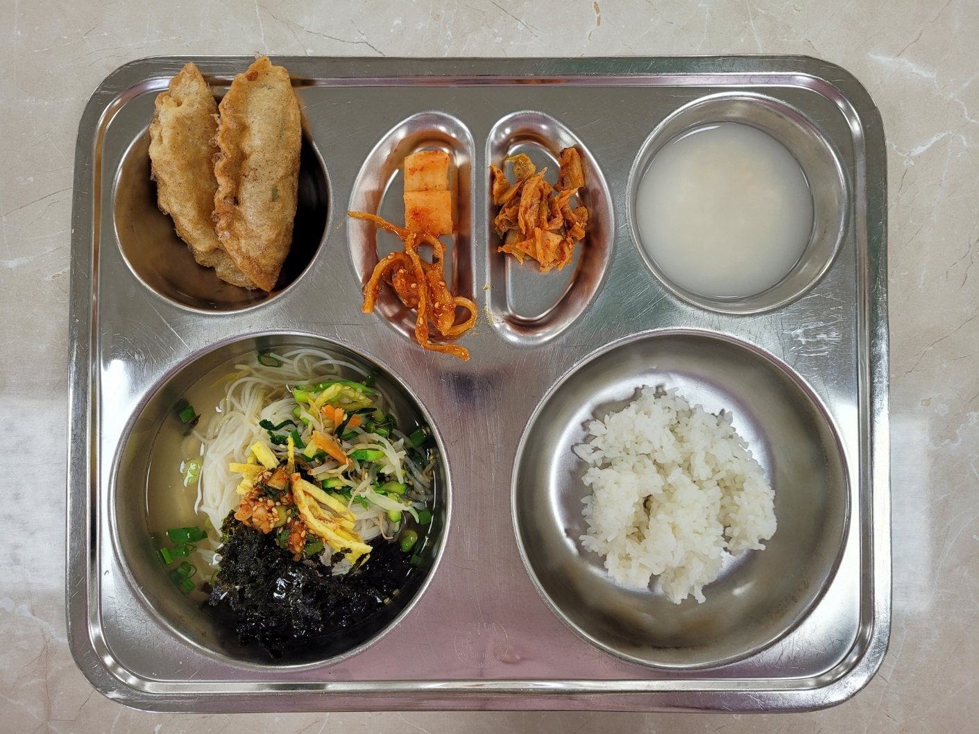 2025년3월26일 (수) 다채롭데이식단: 쌀밥(자), 잔치국수, 진미채무침, 김치볶음, 부추당면왕교자만두, 깍두기, 누룽지탕(자)