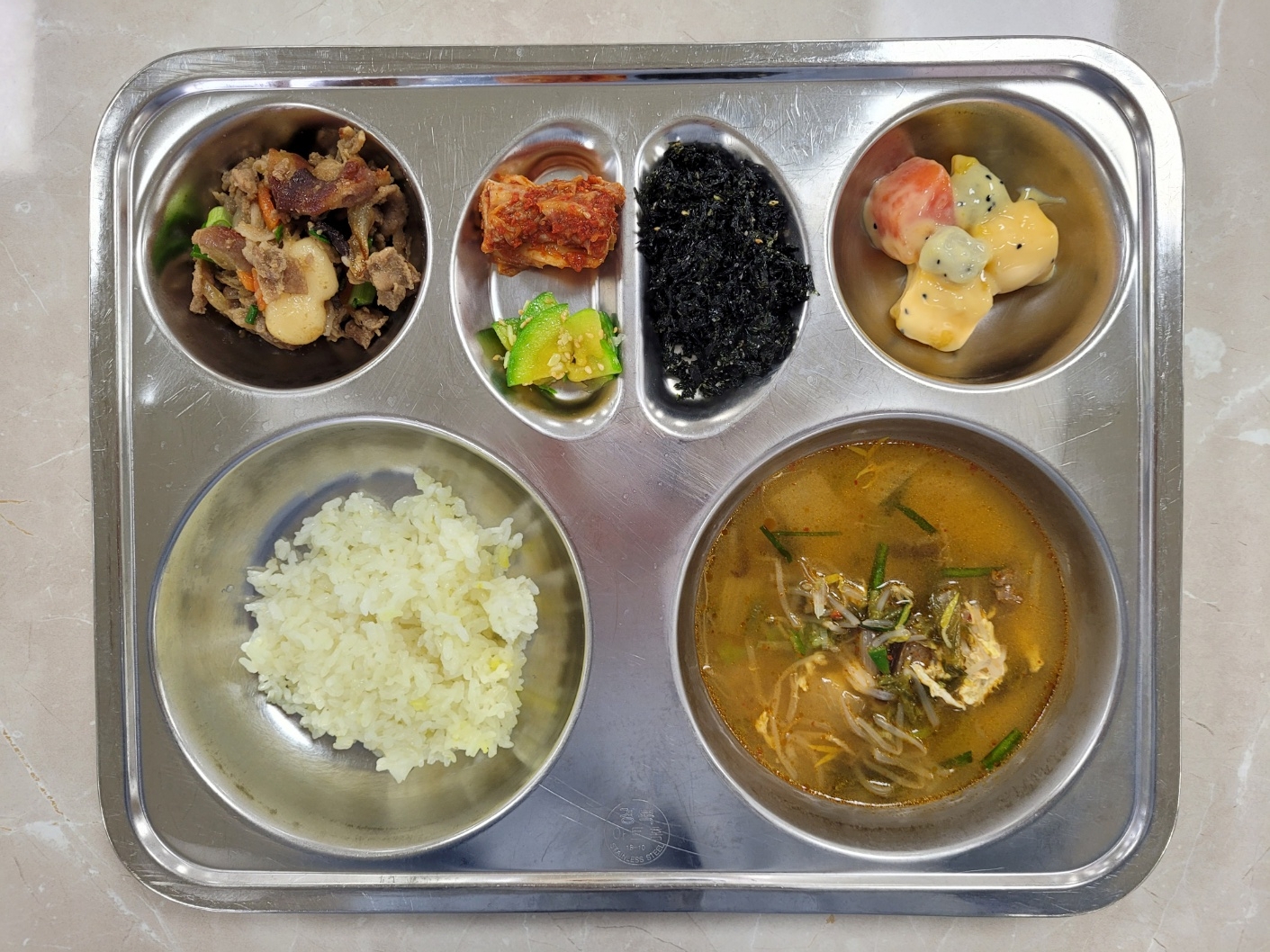 2025년3월27일 (목) 식단: 강황쌀밥, 육개장, 애호박나물, 열대과일샐러드, 바싹떡불고기, 수제파래김자반, 배추김치