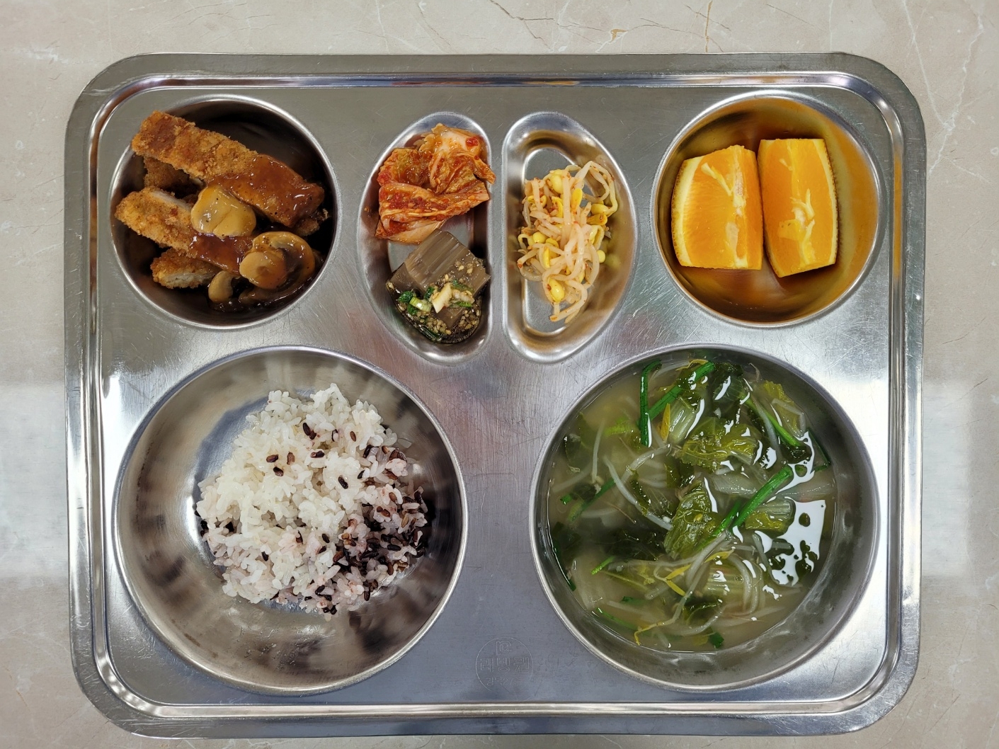 2025년4월3일 (목) 식단: 발아흑미밥, 추어탕, 도토리묵/양념장(자), 콩나물무침, 수제돈까스, 배추김치, 오렌지