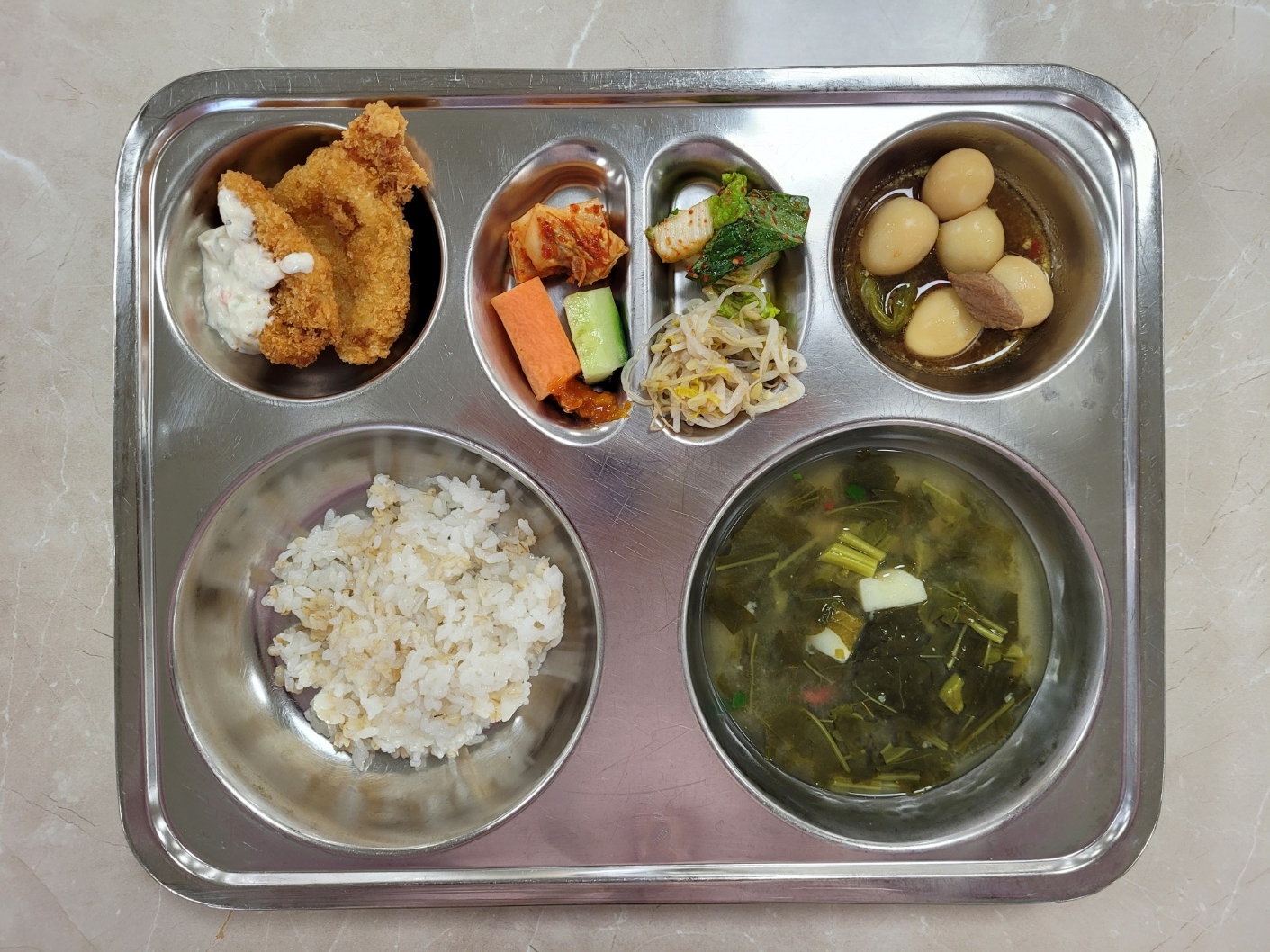 2025년4월7일 (월) 식단: 찰보리밥, 아욱국(건새우), 메추리알장조림, 단배추겉절이(자), 숙주나물무침. 생선커틀렛/소스. 배추김치, 오이당근스틱(자)