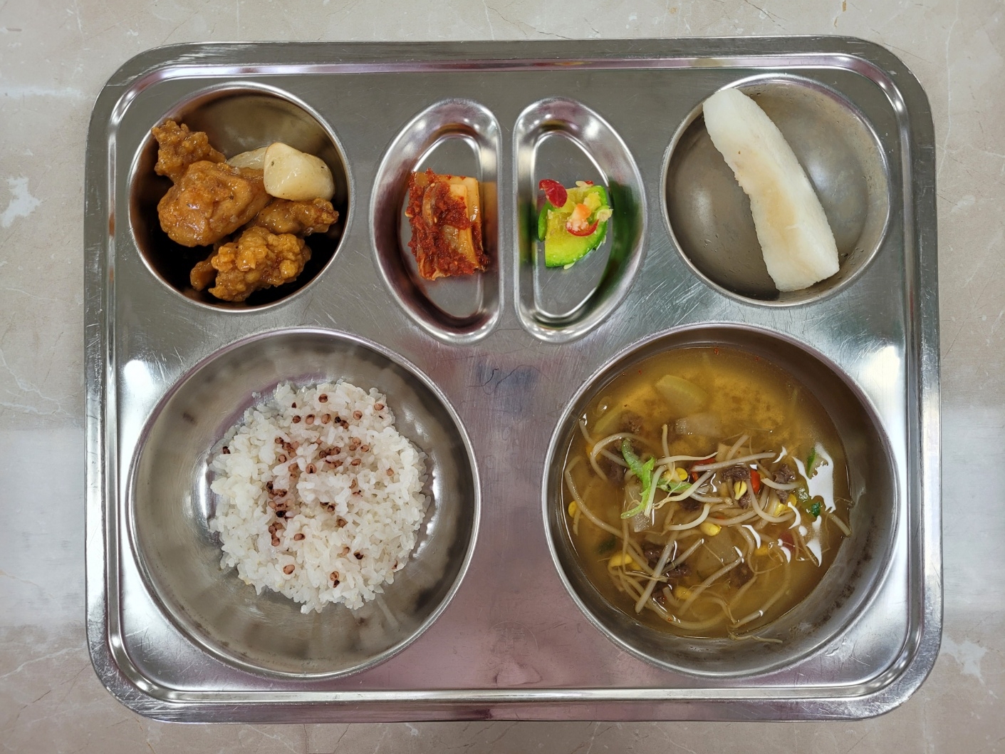 2025년4월9일 (수) 식단: 차수수밥, 쇠고기무국, 애호박나물, 순살치킨떡강정, 배추김치, 배