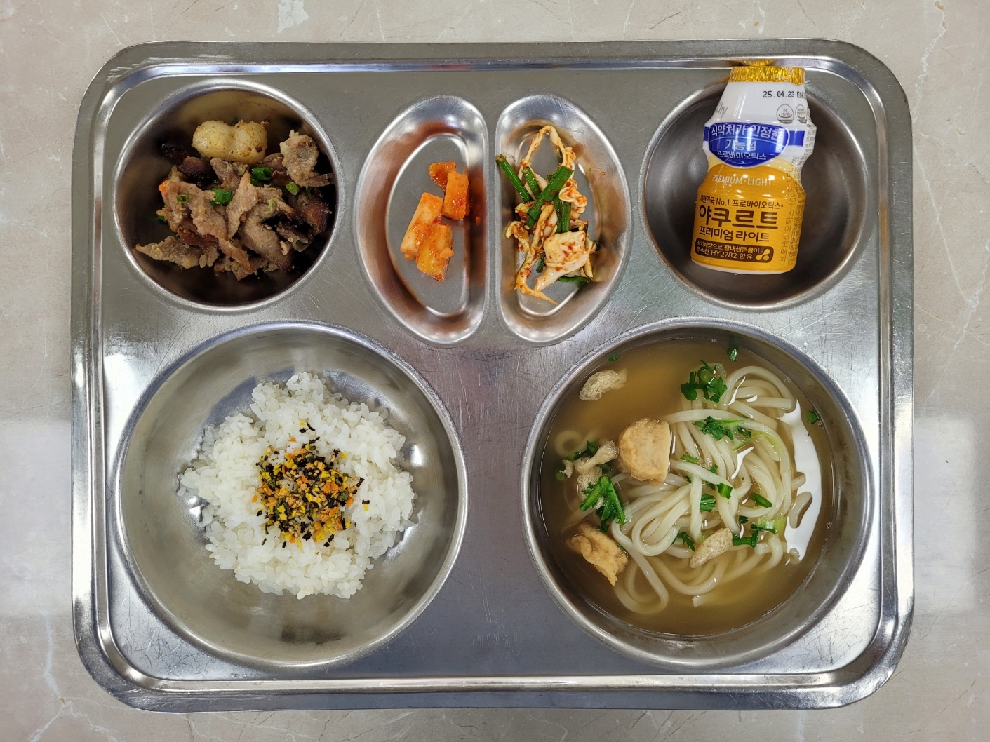 2025년4월11일 (금) 식단: 쌀밥/후리카케(채소), 가쓰오우동장국, 양배추부추무침, 바싹떡불고기, 깍두기, 마시는멀티비타요구르트