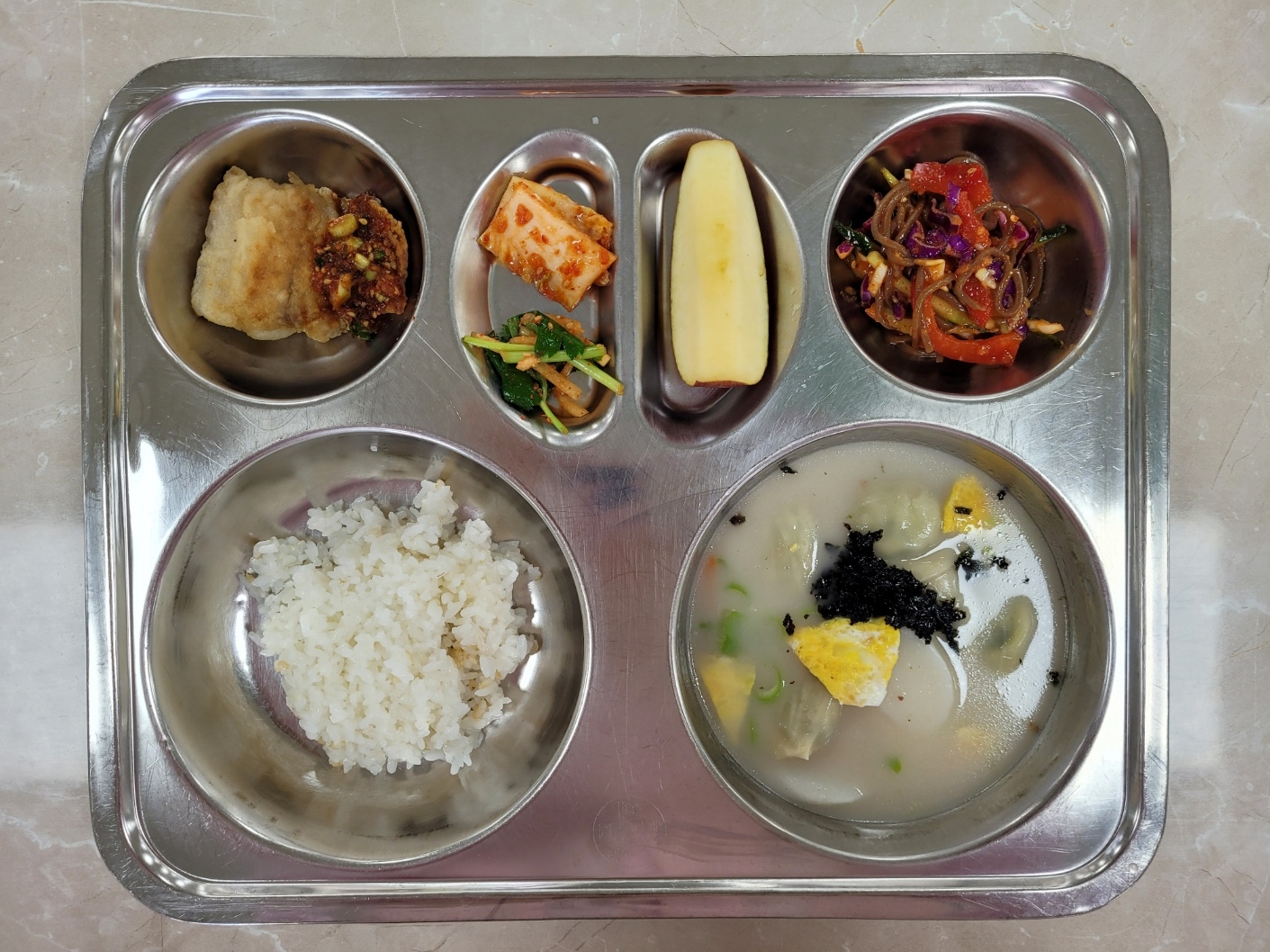 2025년4월24일 (목) 식단: 발아현미밥, 사골떡만두국, 비빔막국수, 참나물무생채, 삼치구이/양념장, 배추김치, 사과