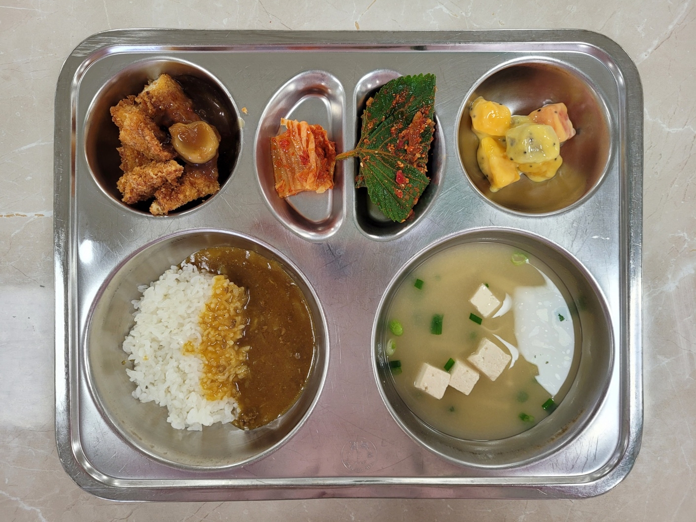 2025년4월25일 (금) 식단: 백미찹쌀밥, 일본식카레, 미소국, 생깻잎지(자), 열대과일샐러드, 치킨커틀렛/소스, 배추김치
