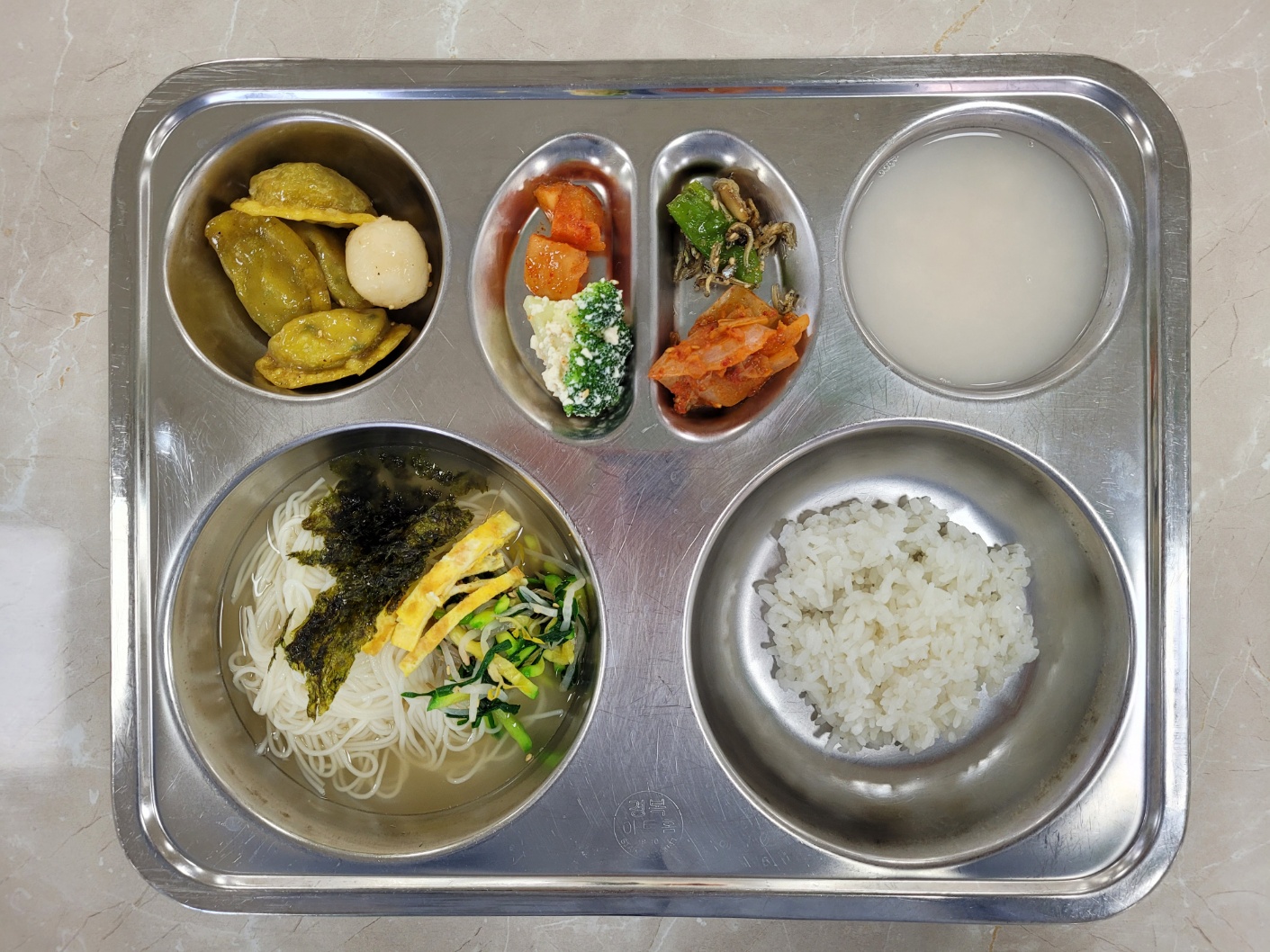 2025년4월29일 (화) 다채롭데이식단: 쌀밥(지), 잔치국수, 김치볶음, 브로콜리두부무침(자), 마늘편멸치볶음, 미니만두떡강정, 깍두기, 누룽지탕(자)