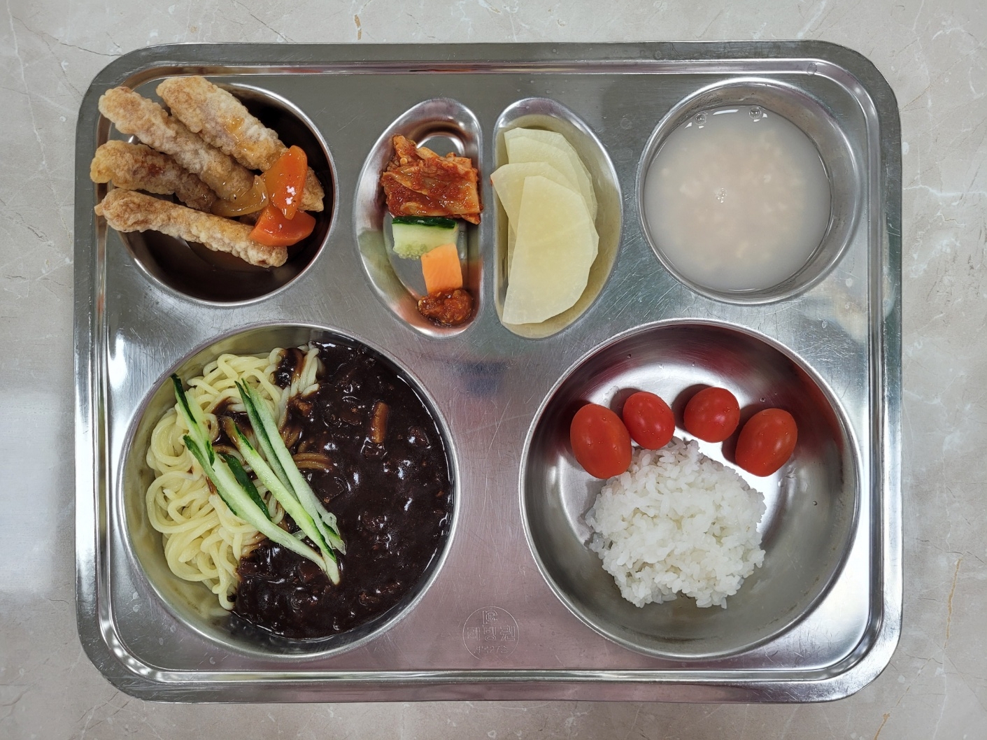 2025년5월16일 (금) 식단: 쌀밥(자), 누룽지(자), 우리밀짜장면, 찹쌀탕수육, 배추김치, 대추방울토마토, 단무지, 오이당근스틱(자)