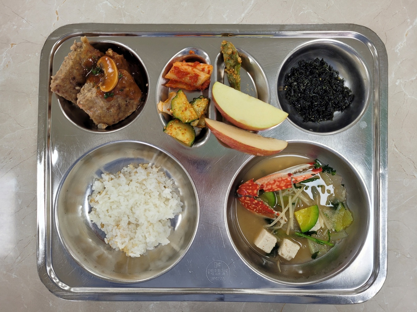 2025년5월19일 (월) 식단: 발아현미밥, 꽃게탕, 오이깍둑무침, 수제파래김자반, 수제함박스테이크, 배추김치, 꽈리고추찜(자), 사과