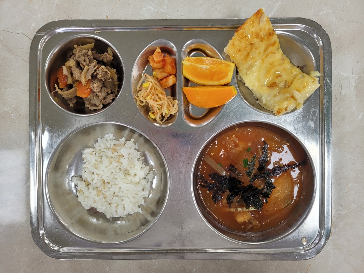 2025년5월22일 (목) 식단: 발아현미밥, 도토리묵냉국, 콩나물무침, 돼지고기간장불고기, 깍두기, 고르곤졸라사각피자, 오렌지
