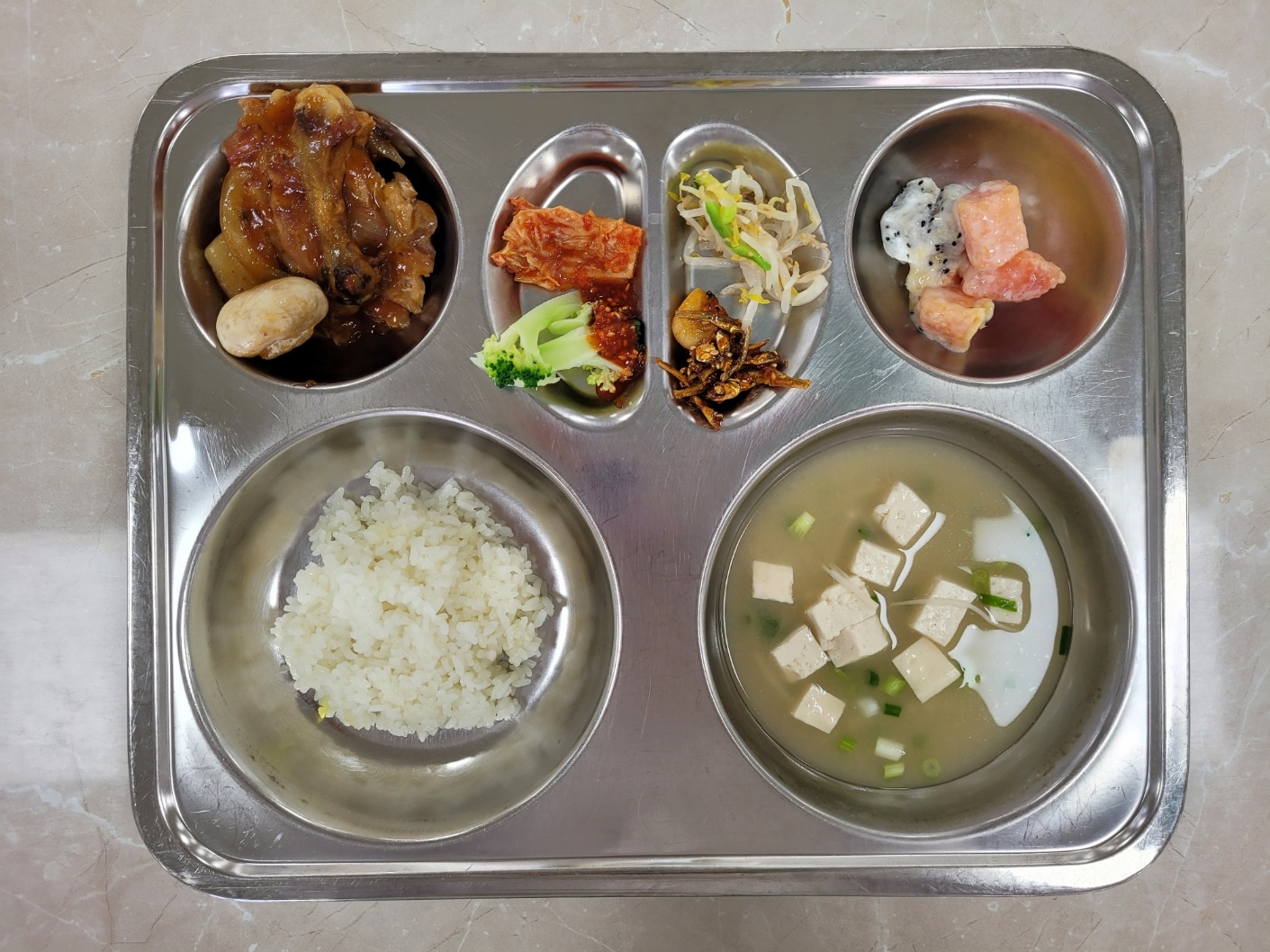 2025년5월28일 (수) 식단: 강황쌀밥, 미소국, 숯불스테이크, 숙주애호박나물, 열대과일샐러드, 마늘편멸치볶음, 배추김치, 브로콜리초고추장(자)