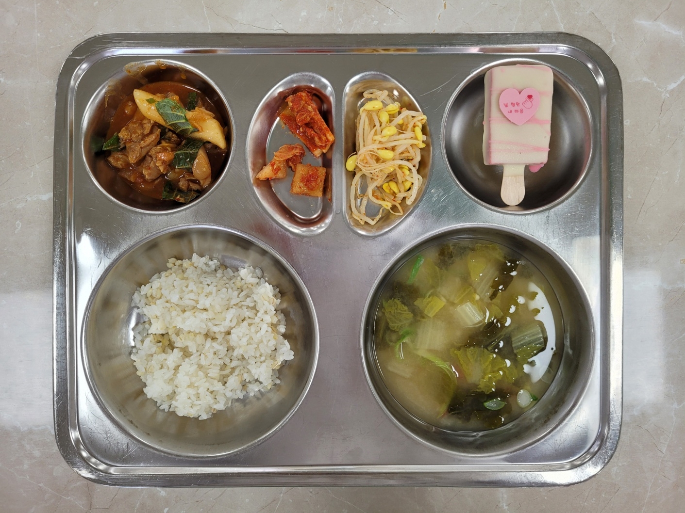2025년5월30일 (금) 식단: 찰보리밥, 단배추된장국, 콩나물무침, 뼈없는닭갈비, 깍두기, 배추김치(자), 하트딸기치즈케잌바