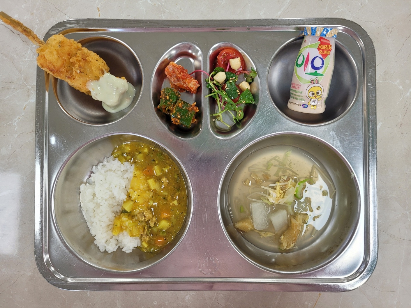 2025년6월4일 (수) 식단: 파니르커리/쌀밥, 북어콩나물국, 방울토마토카프레제, 미니똑닭, 배추김치, 미니요구르트, 아삭고추된장무침(자).