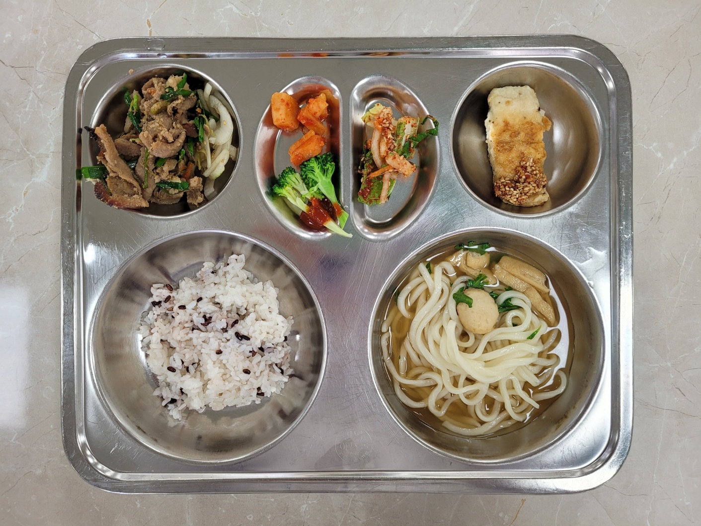 2025년6월10일 (월) 식단: 발아흑미밥, 가쓰오우동장국, 모듬야채겉절이, 바싹불고기/양파초절이, 삼치구이/양념장, 깍두기, 브로콜리초고추장(자)