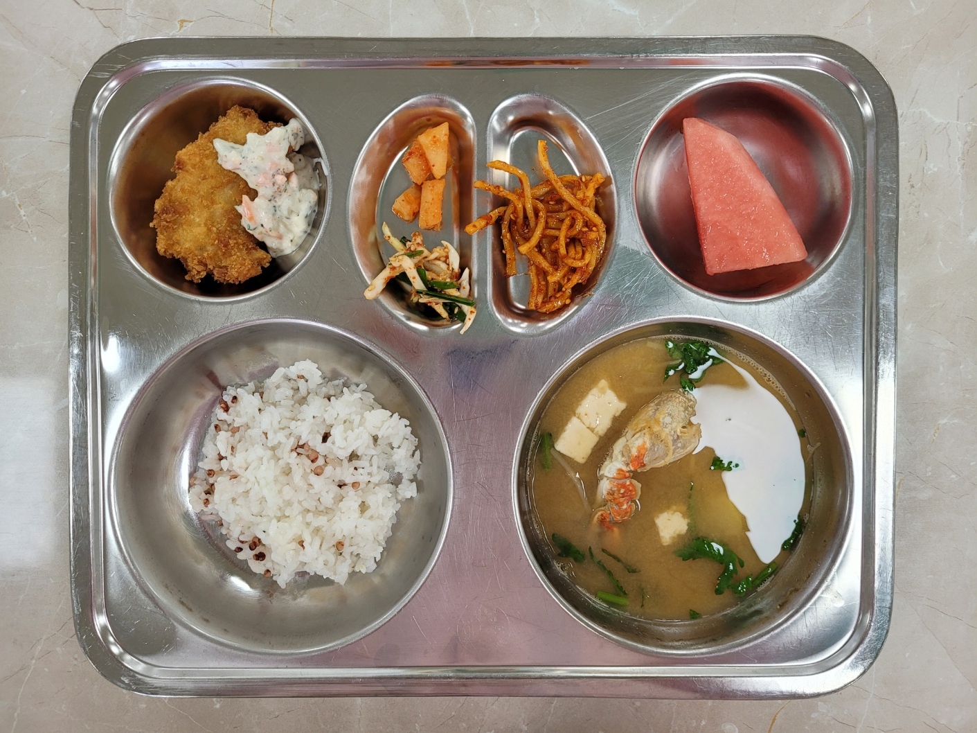 2025년6월13일 (목) 다채롭데이식단: 차수수밥, 꽃게탕, 양배추부추무침, 생선커틀렛/소스, 진미채무침, 깍두기, 수박
