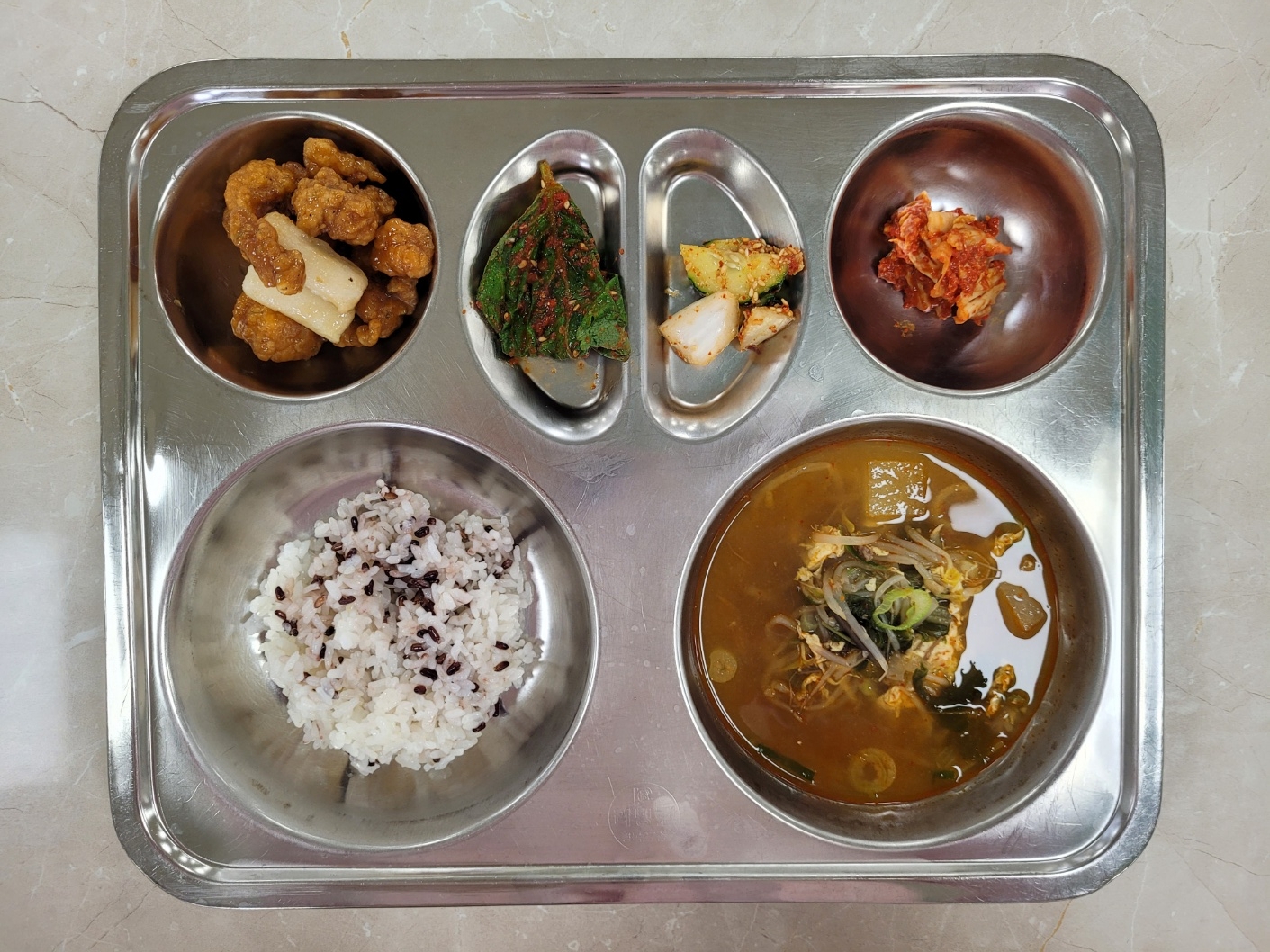 2025년6월16일 (월) 식단: 발아흑미밥, 육개장, 오이깍둑무침, 돈육등심강정, 배추김치, 생깻잎지(자)