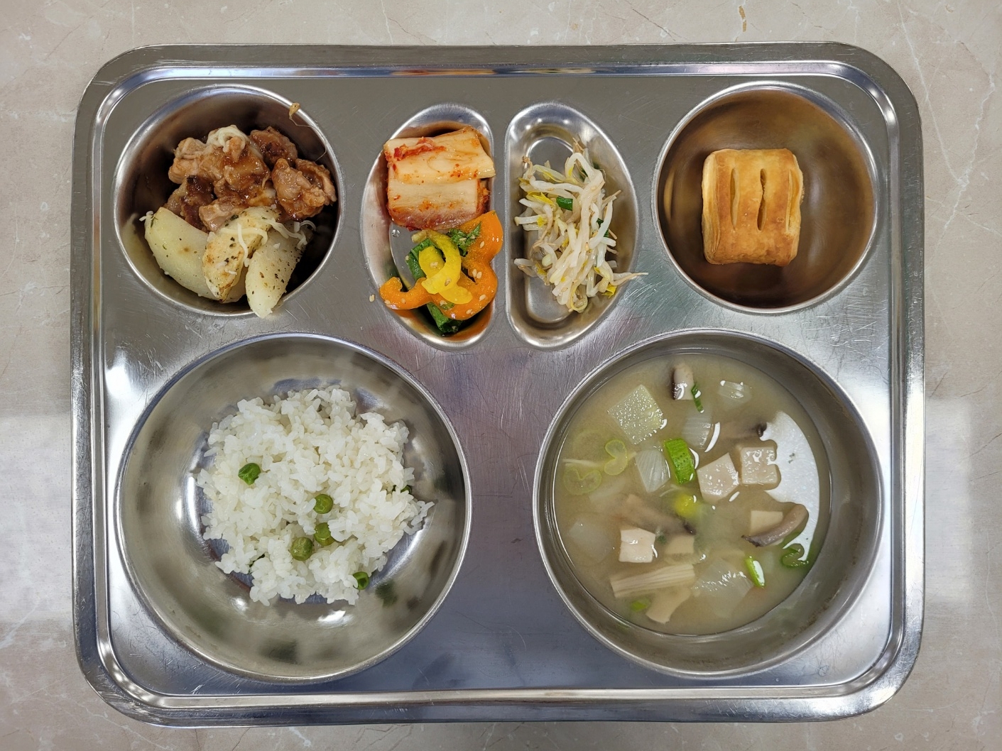 2025년6월23일 (월) 백리밥상(밀양아리랑밥상)식단: 완두콩밥, 버섯된장국, 숙주나물무침, 오븐치킨스테이크/눈꽃치즈감자, 배추김치, 우리밀미니애플파이, 깻잎참깨샐러드(자)