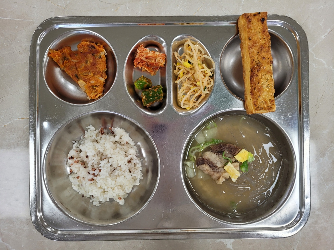 2025년7월2일 (수) 식단: 차수수밥, 갈비탕, 콩나물무침, 김치전, 배추김치, 갈릭파이, 아삭고추된장무침(자)