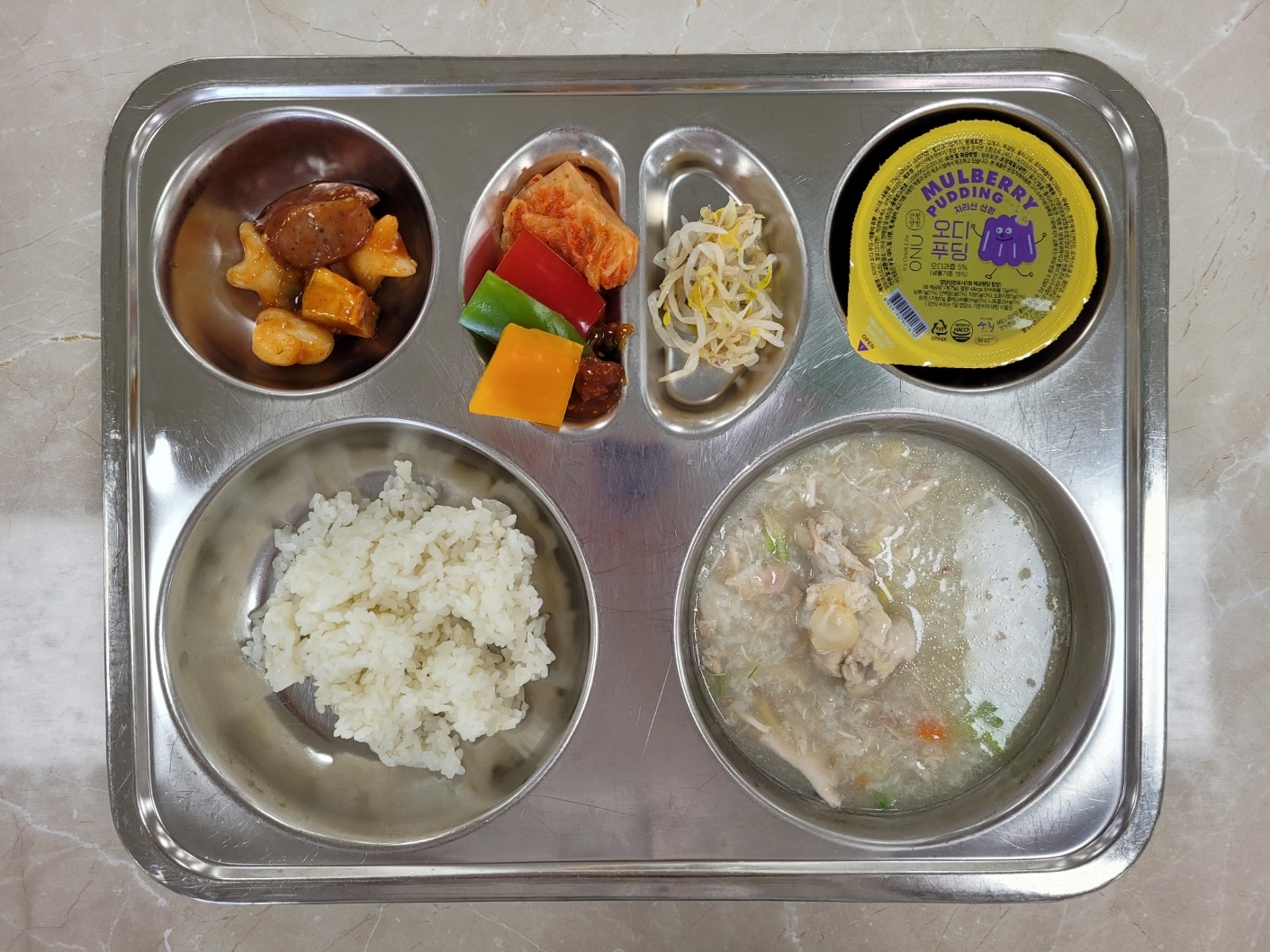 2025년7월7일 (월) 산청동의보감식단: 백미찹쌀밥, 닭봉한방삼계탕, 숙주나물무침, 오븐모듬강정, 배추김치, 오디푸딩, 파프리카(자)