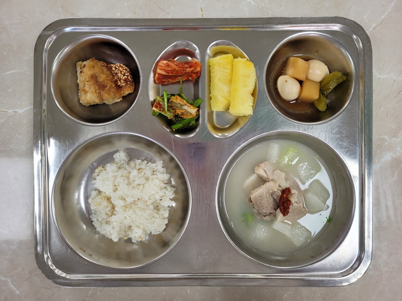 2025년7월10일 (목) 식단: 찰보리밥, 돼지따로국밥, 메추리알감자조림, 얼갈이부추겉절이, 삼치구이/양념장, 배추김치, 파인애플