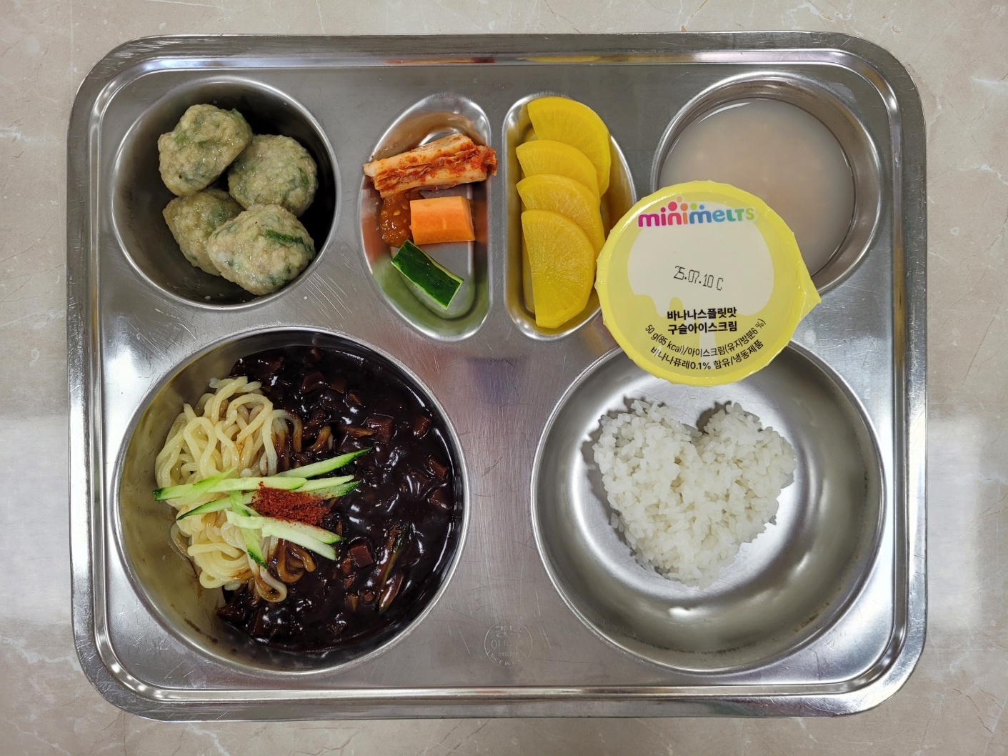 2025년7월22일 (화) 식단: 쌀밥(자), 누룽지탕(자), 우리밀짜장면, 우리밀굴림만두, 베추김치, 바나나구슬아이스크림, 단무지, 오이당근스틱(자)