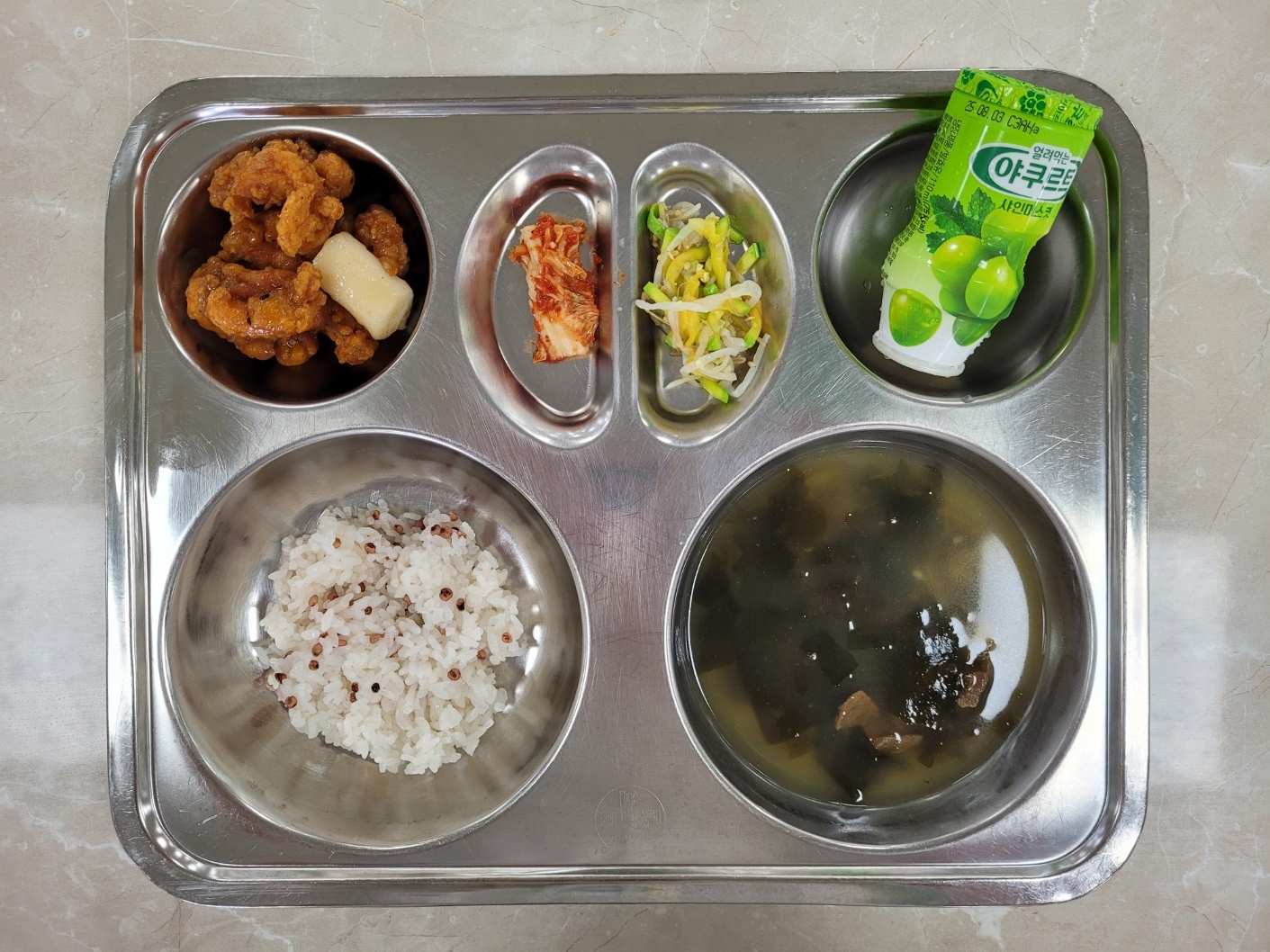 2025년7월23일 (수) 식단: 차수수밥, 쇠고기미역국, 숙주애호박나물, 순살치킨떡강정, 배추김치, 청포도요구르트
