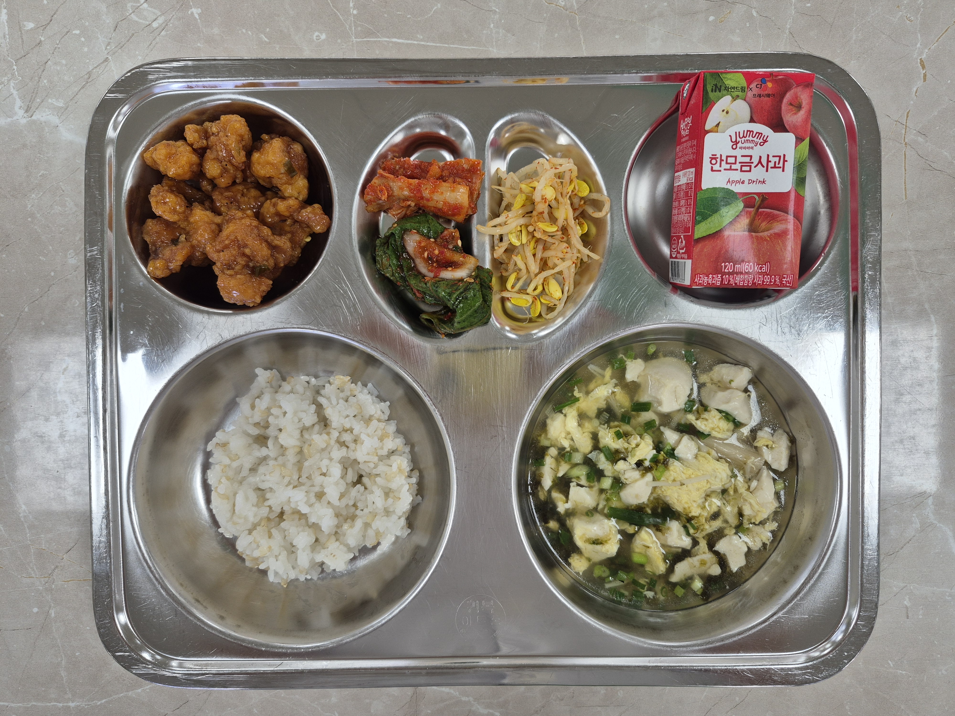 2025년8월20일 (수) 식단: 발아현미밥, 순두부달걀탕, 생깻잎지(자), 콩나물무침, 갈릭치킨, 배추김치, 미니사과쥬스,