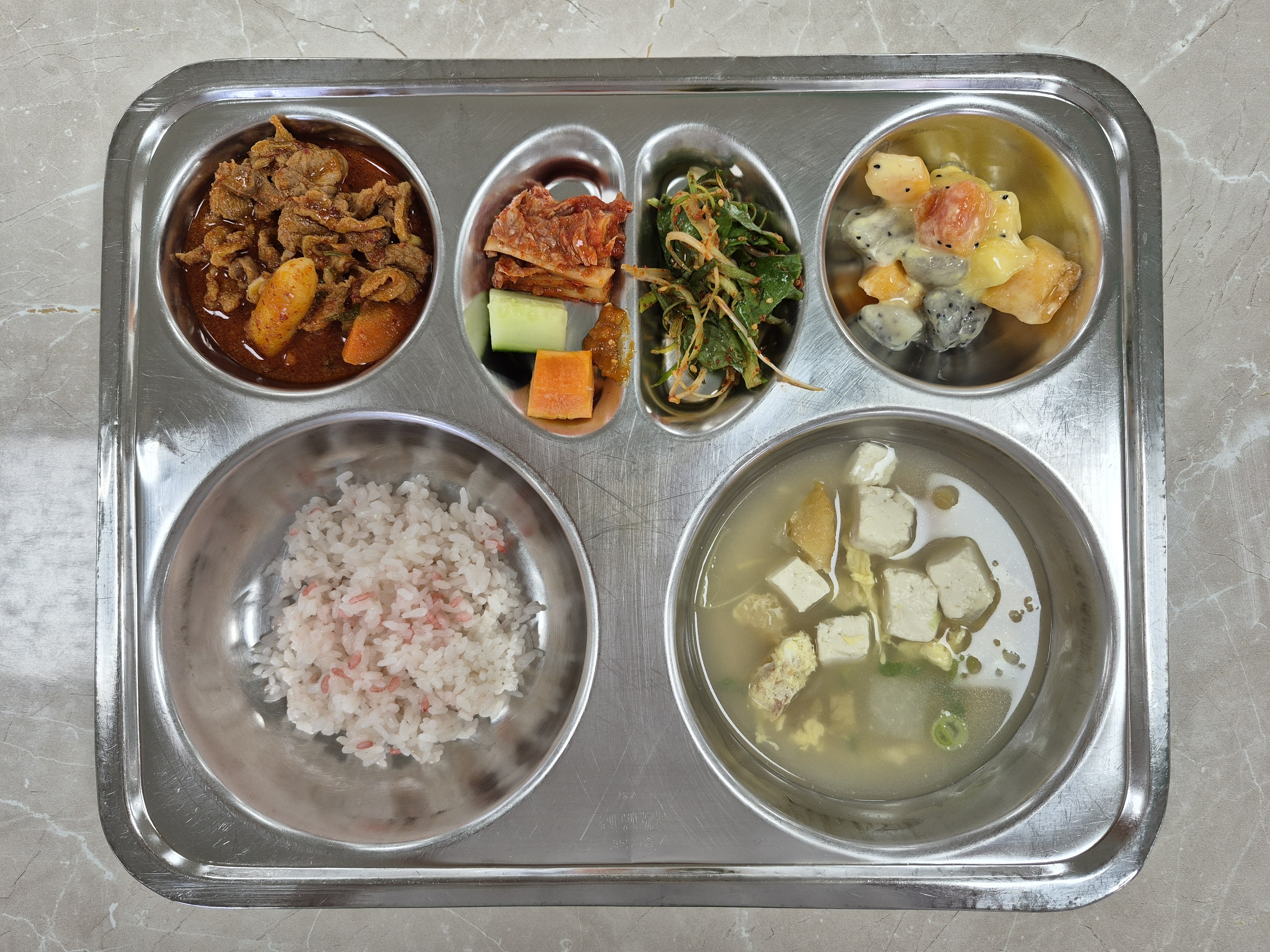 2025년8월21일 (목) 식단: 홍국쌀밥, 북어두부국, 상추파절이, 열대과일샐러드, 오리불고긱, 배추김치, 오이당근스틱(자)