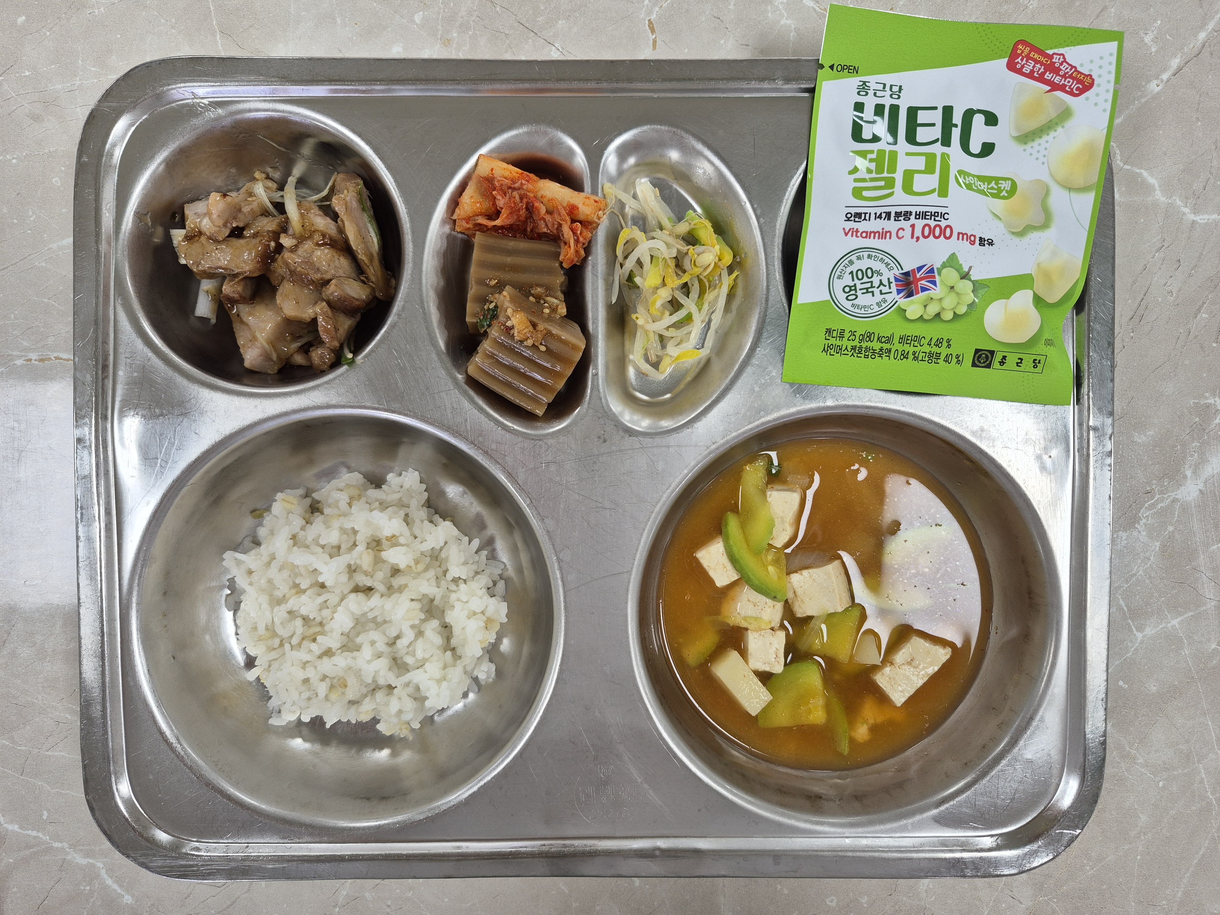 2025년 9월15일 (월) 식단: 찰보리밥, 호빅고추장찌개, 동파육, 숙주애호박나물, 배추김채, 비타씨젤리, 도토리묵/양념장(자)